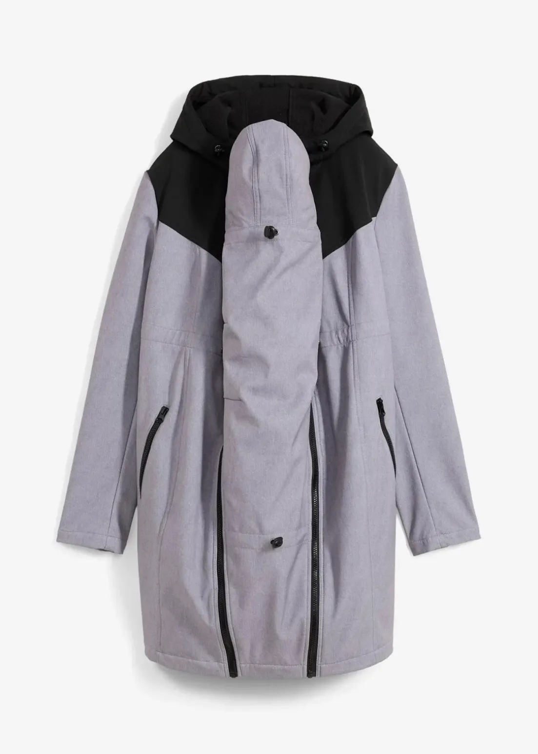 Kurzer, regen- und windabweisender Funktionsmantel mit einem Trageeinsatz für das Baby mit einer kleinen Kapuze. Mit großen Taschen vorne, die sich mit Reißverschlüssen schließen lassen und einer Kordelzugkapuze. Seitliche Reißverschlüsse dienen der Regulierung der Weite, die das Tragen sowohl in als auch nach der Schwangerschaft ermöglichen. Ein verstellbar Kordelzug an der Taille lässt sich dem jeweiligen Schwangerschaftsmonat anpassen.