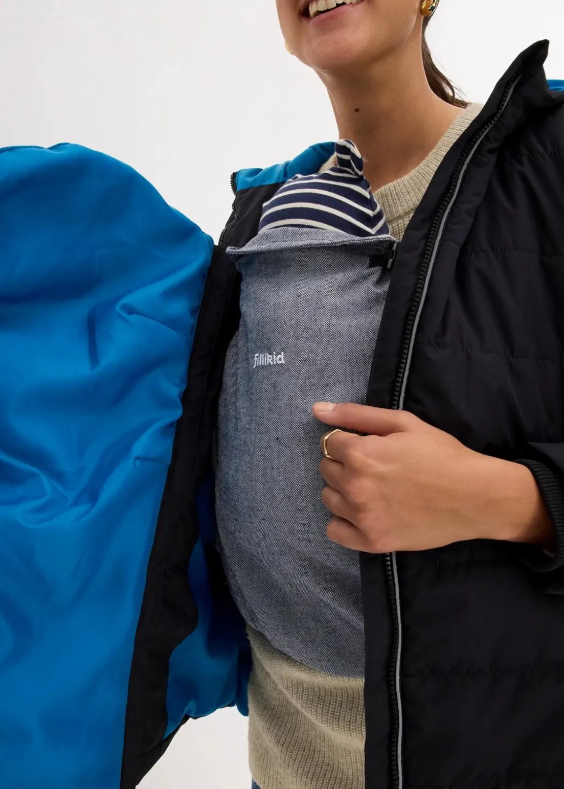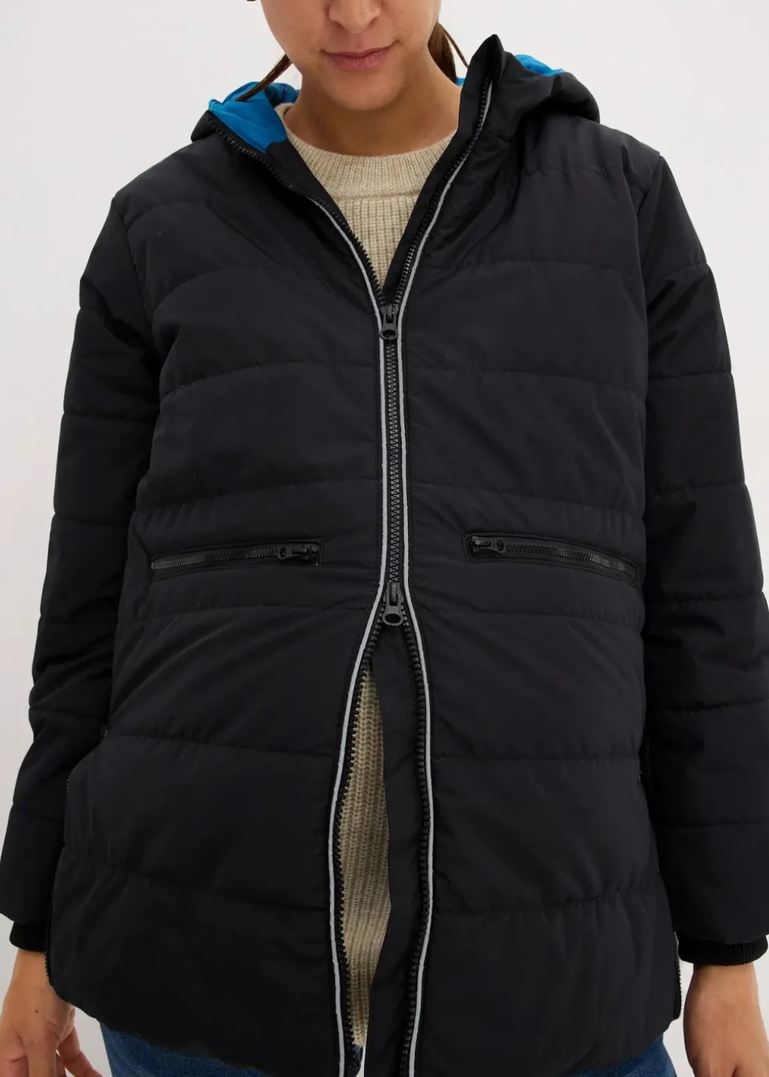 Wattierte Umstandsjacke mit Trageeinsatz für das Baby und seitlichen Reißverschlüssen zur Regulierung der Weite, die das Tragen sowohl in, als auch nach der Schwangerschaft ermöglichen. Mit Zippertaschen. Mit modischem Kontrastfutter und Reflektoren, die auch bei Dunkelheit und schlechten Lichtverhältnissen für Sichtbarkeit sorgen.