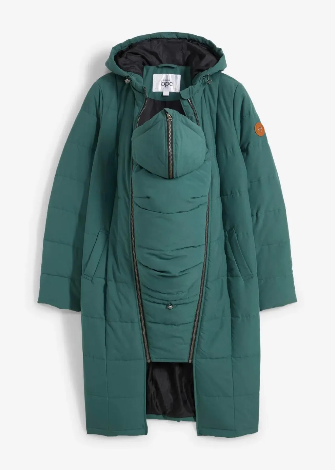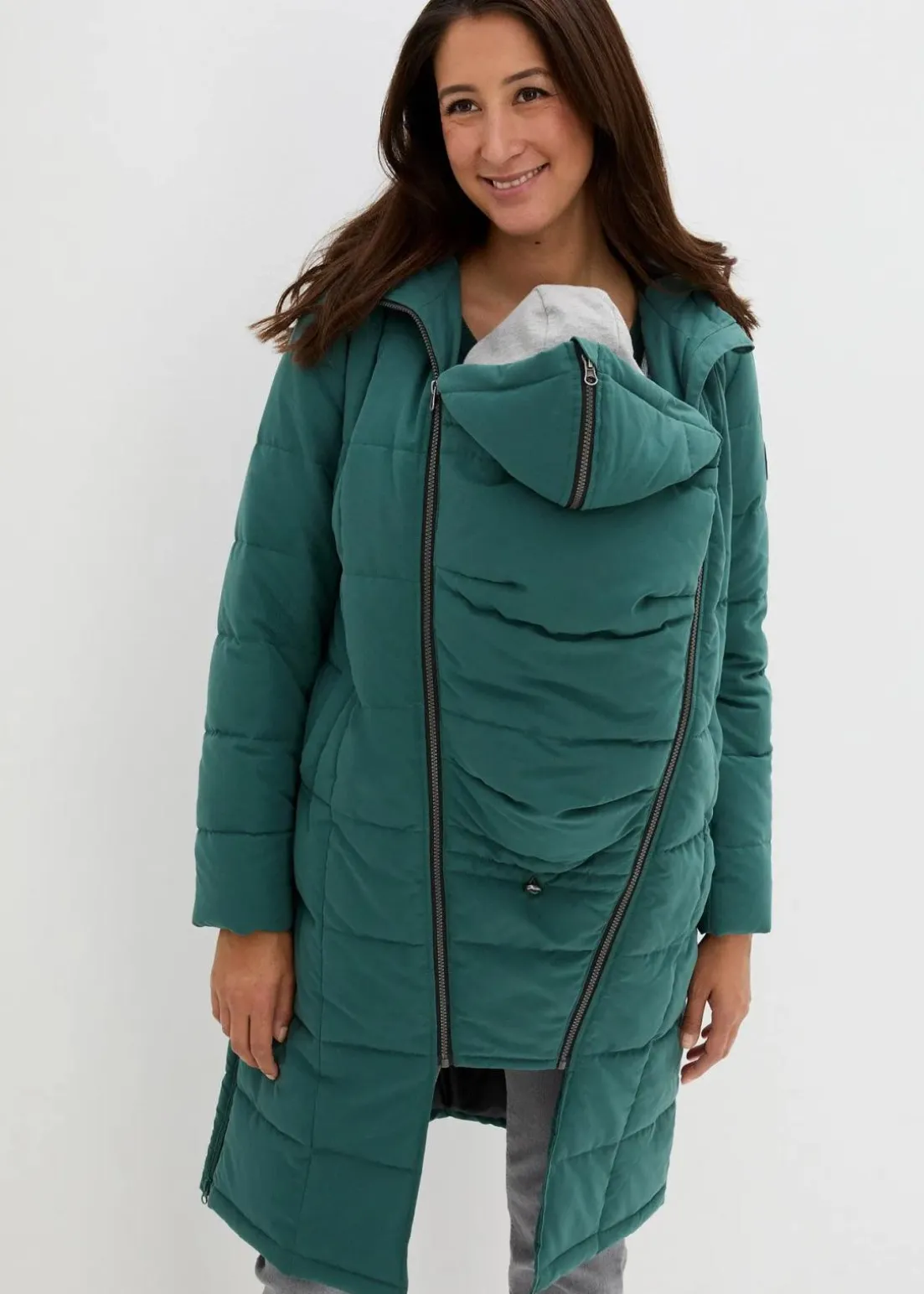 Mittelwarm wattierter Umstandsmantel mit Tragefunktion.