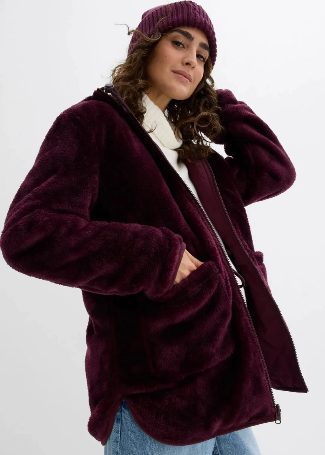 Kuschelige Wendejacke mit zwei Seiten: eine flauschige Teddyseite und eine gesteppte, leicht wattierte Seite. Sie verfügt über eine große Kapuze mit Kordelzügen für die Mutter und eine kleine für das Baby, die sich per Reißverschluss öffnen lässt. Taschen auf beiden Seiten bieten Platz für wichtige Dinge. Ein Kordelzug in der Taille sorgt für eine schöne Silhouette. Der abgerundete Saum mit seitlichen Schlitzen bietet zusätzliche Bewegungsfreiheit und Platz für den wachsenden Babybauch.