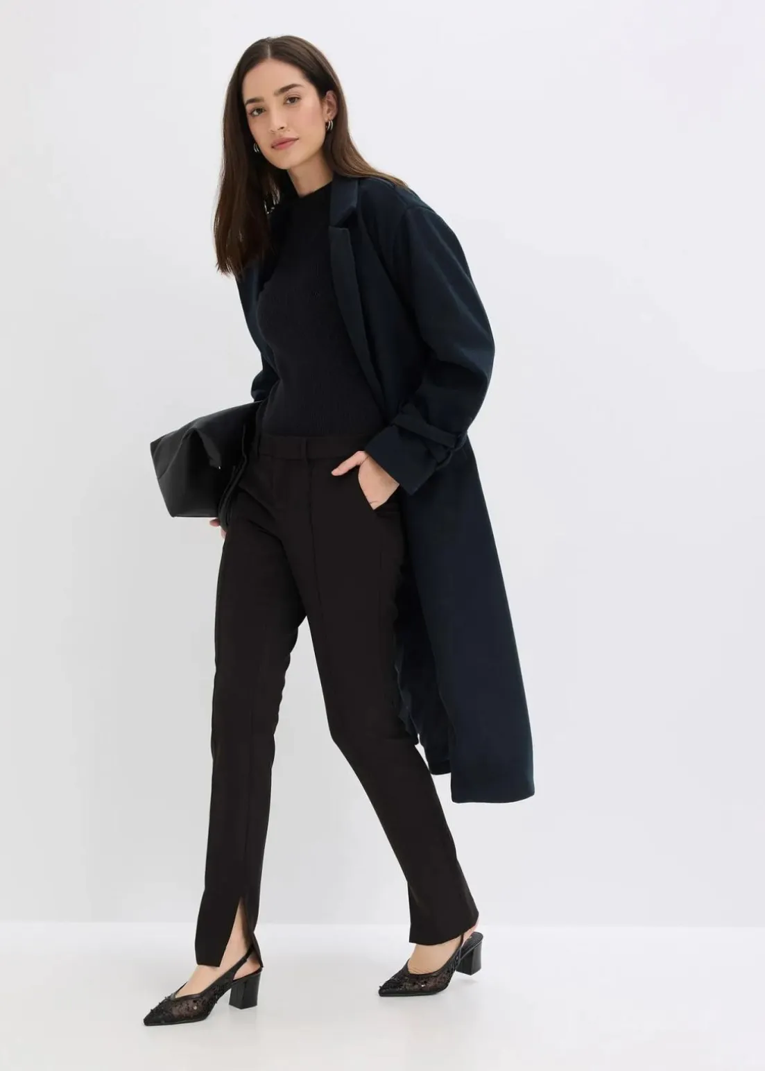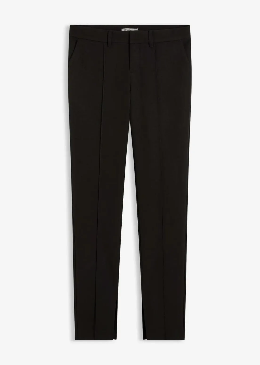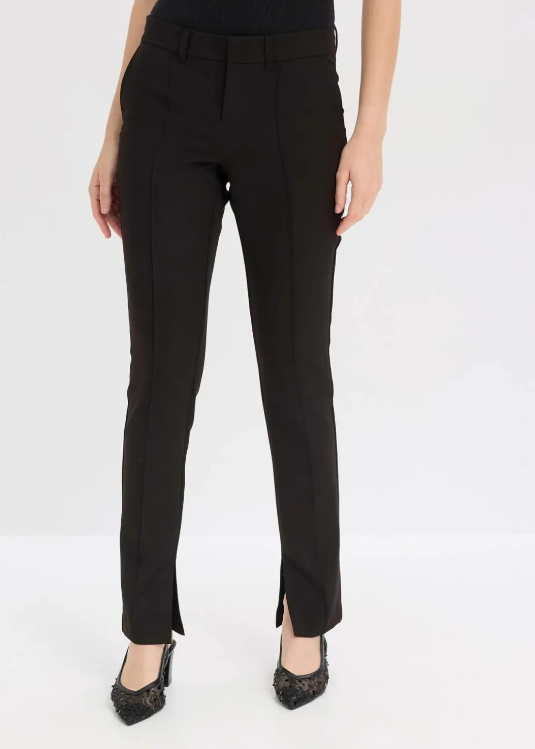 Schmale Hose mit Seitentaschen, verdeckter Knopf-, Haken- und Reißverschluss, Schlitze im Innenbein und Gürtelschlaufen.