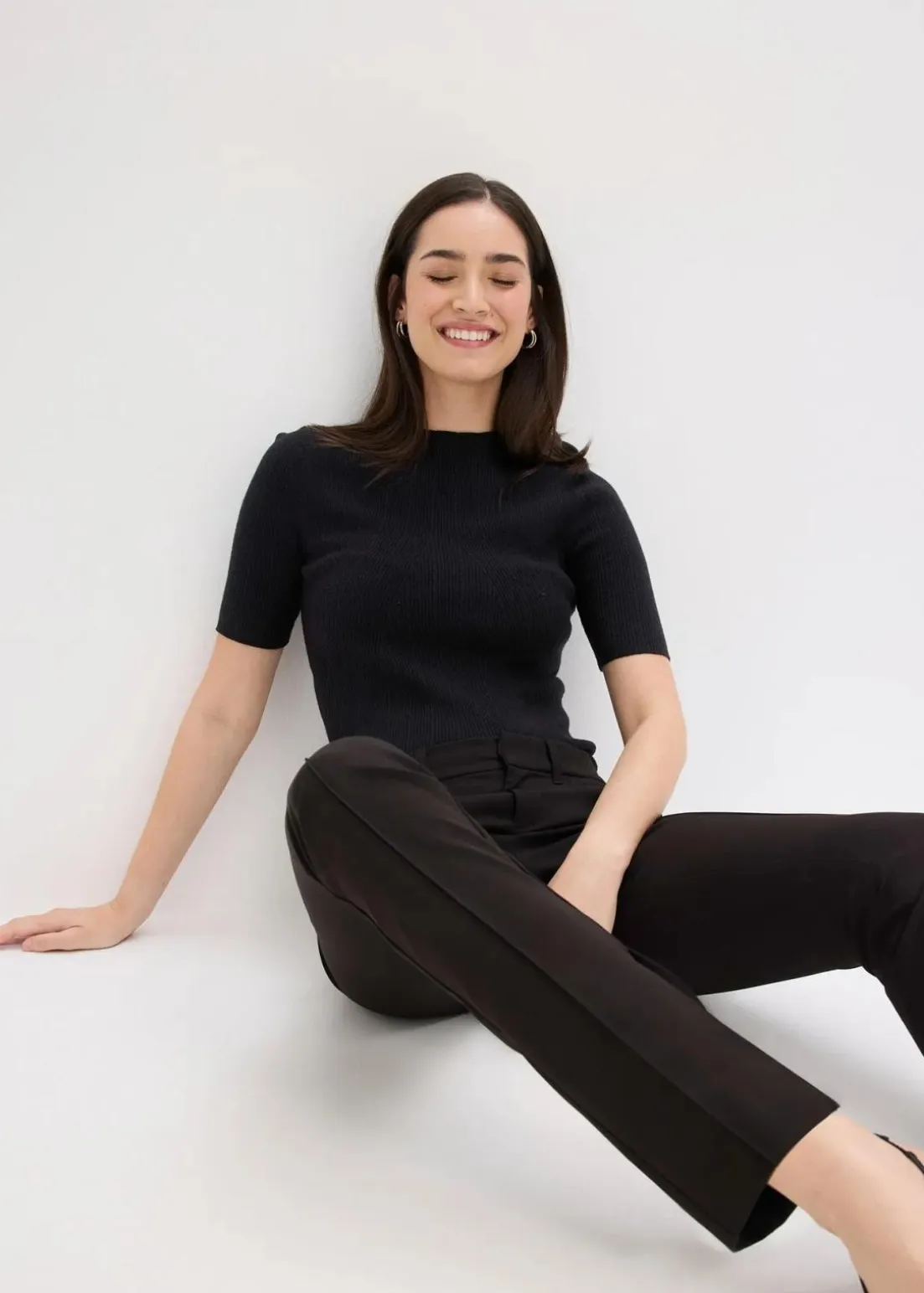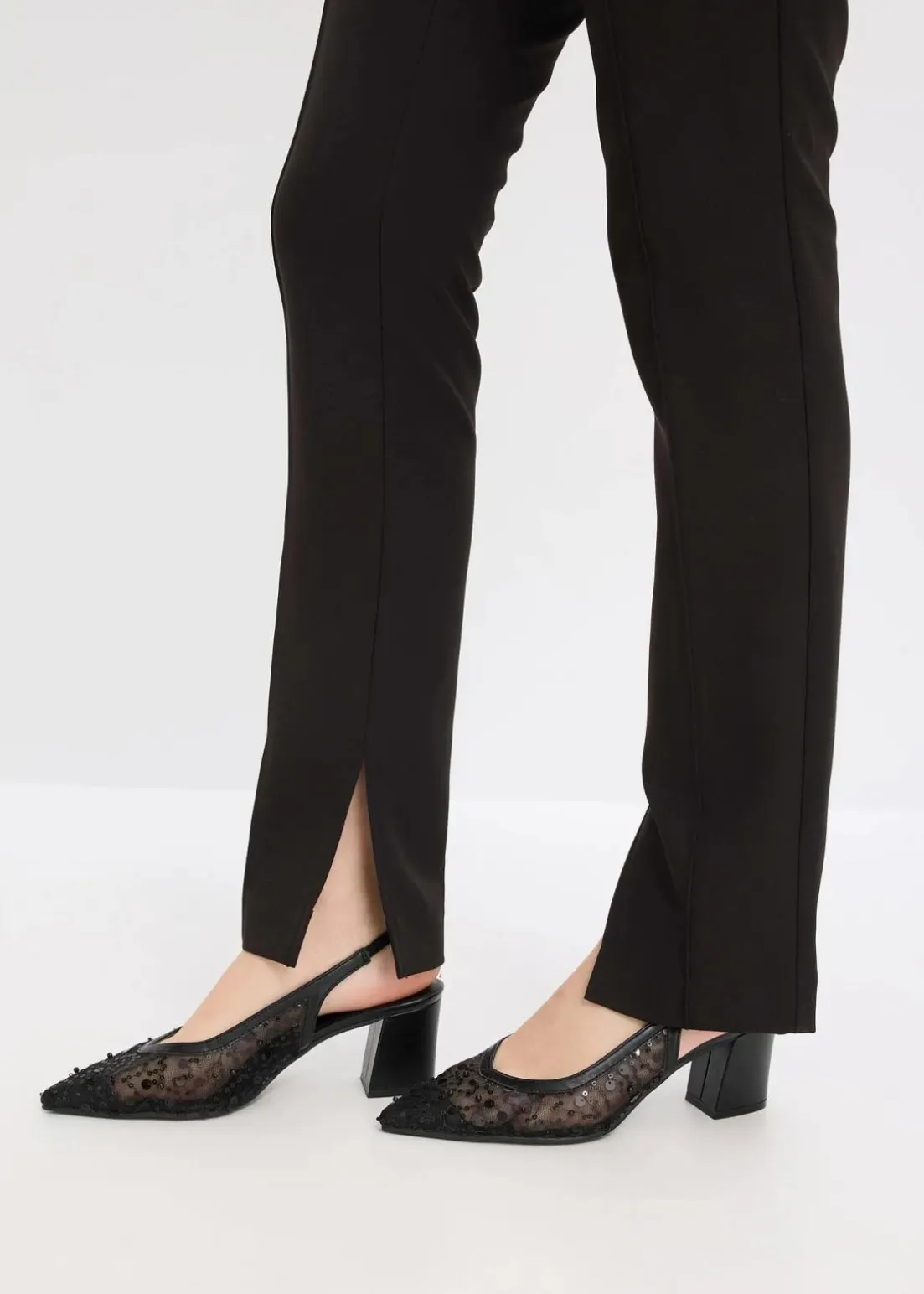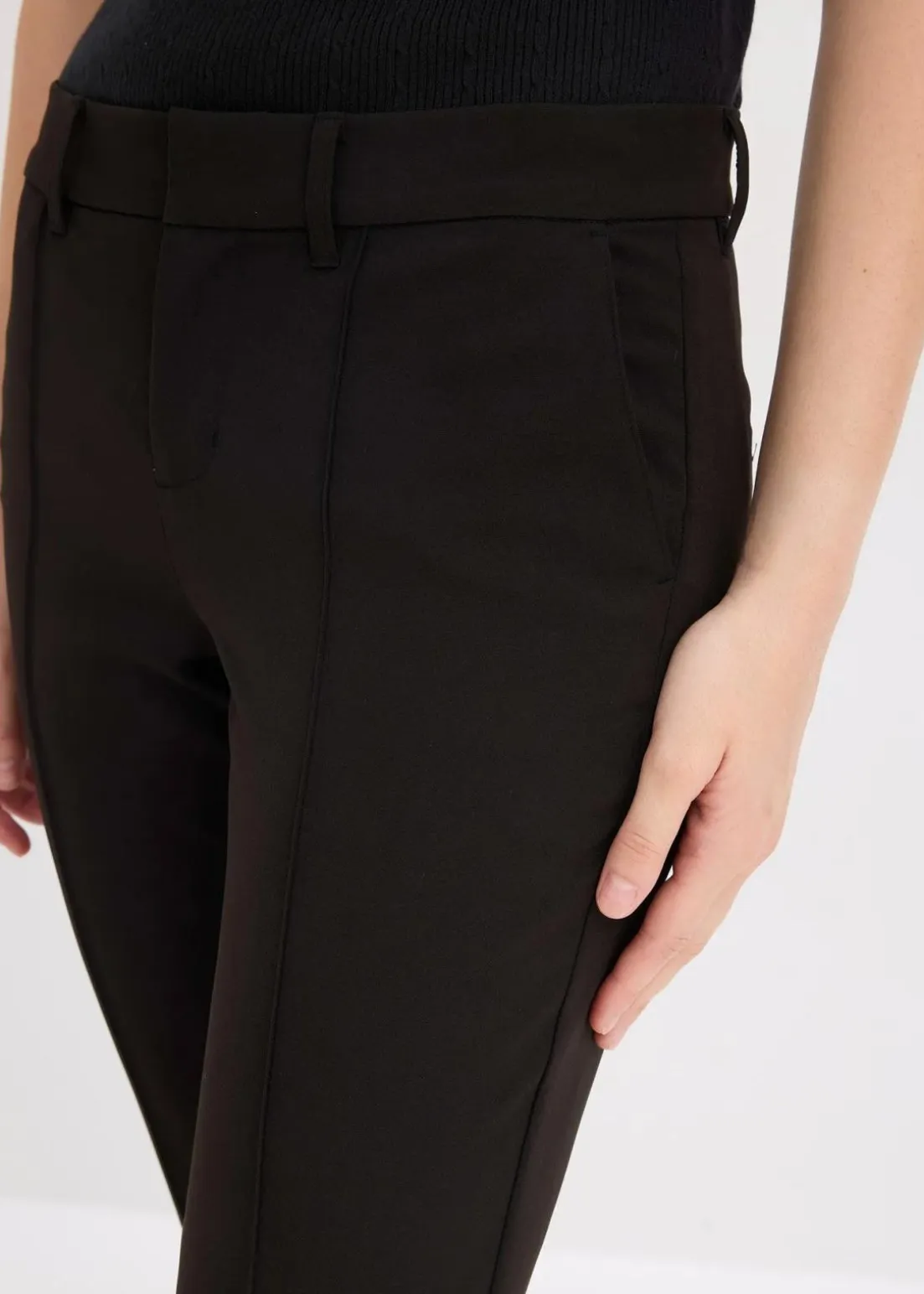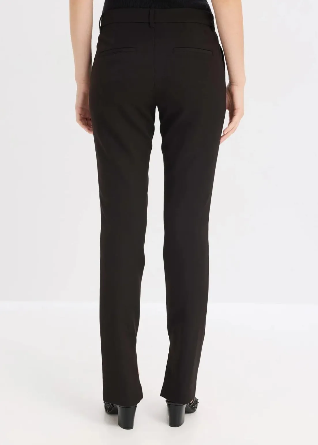 Schmale Hose mit Seitentaschen, verdeckter Knopf-, Haken- und Reißverschluss, Schlitze im Innenbein und Gürtelschlaufen.