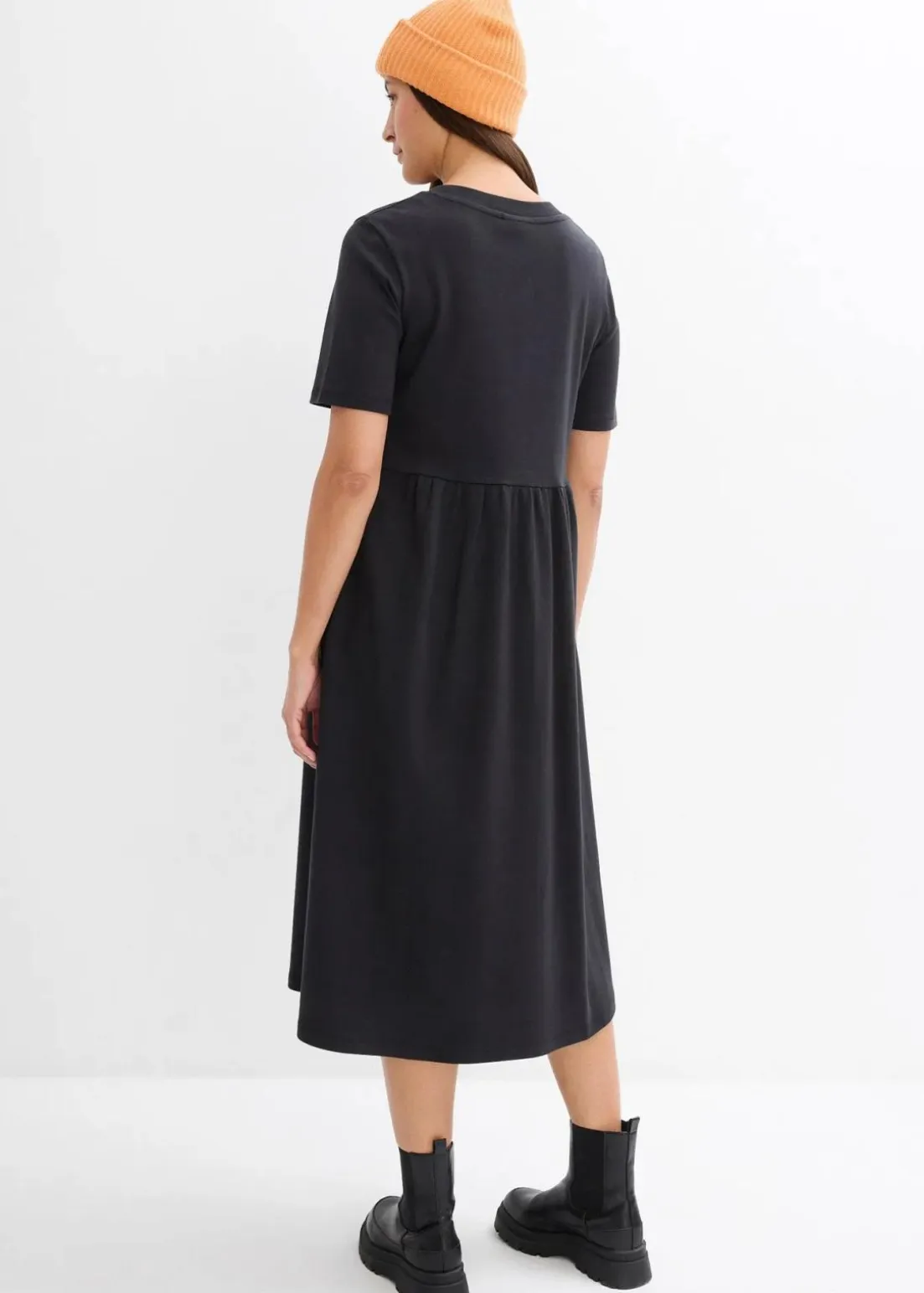Ausgestelltes Jerseykleid mit seitlichem Schlitz, hohem Rundhals und Halbarm