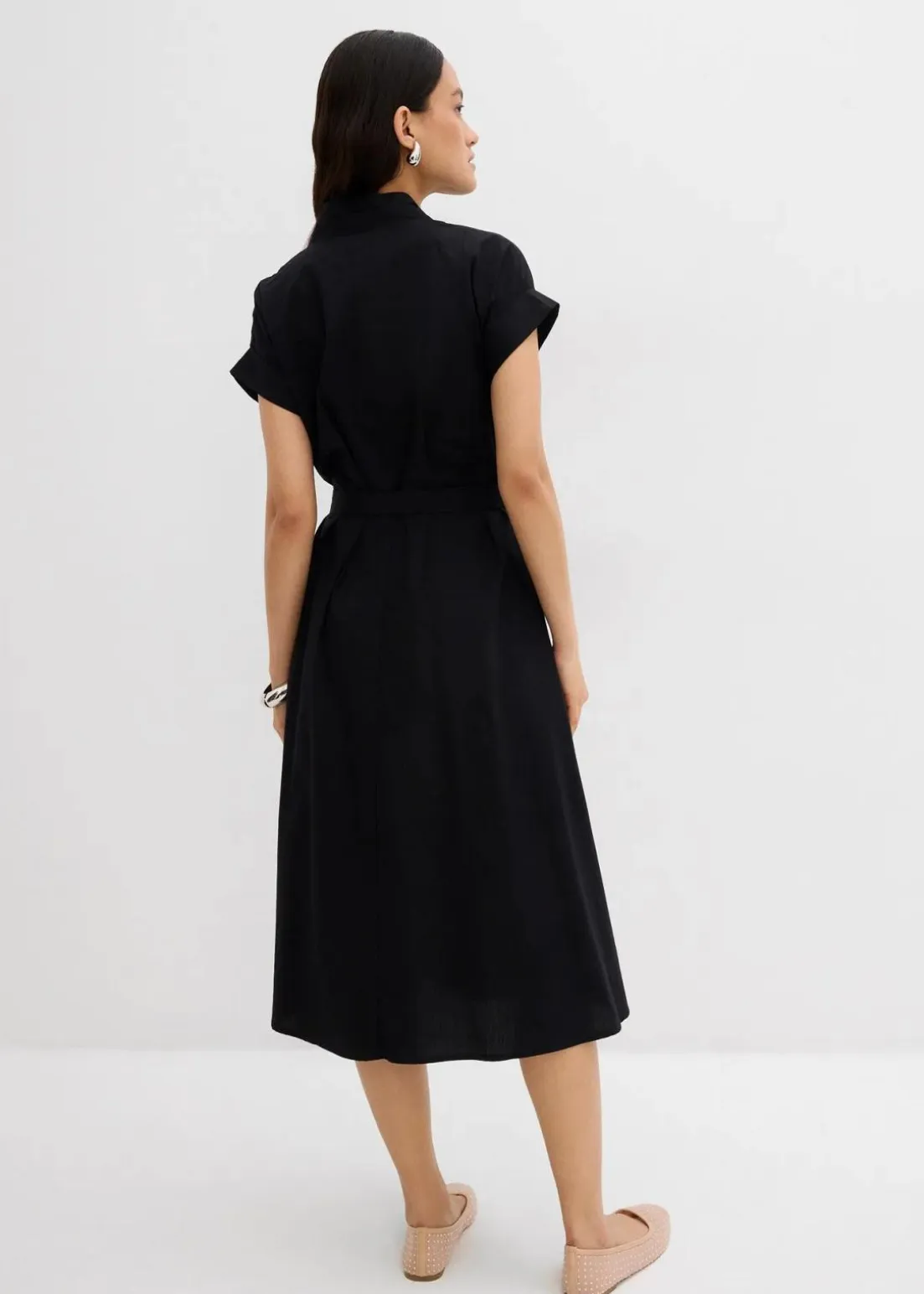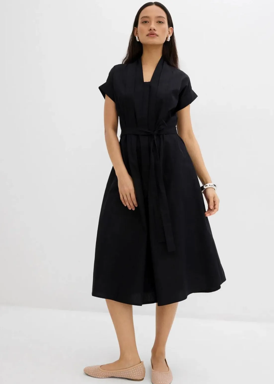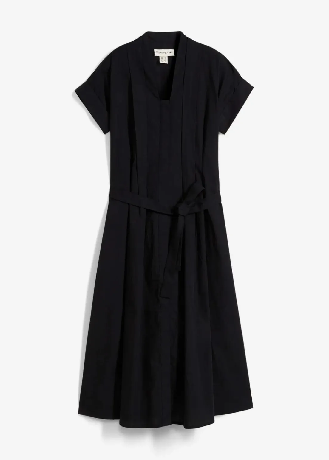 Ausgestelltes Kleid mit V-Ausschnitt, kurzen Ärmeln, verstellbarem Gürtel in der Taille und seitlichen Eingrifftaschen