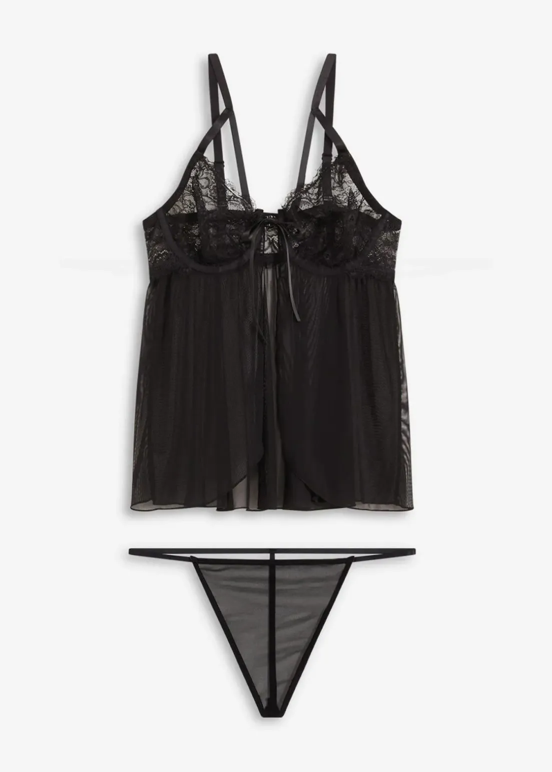 Babydoll + String (2-tlg.Set) aus feiner Spitze und transparentem Mesh.