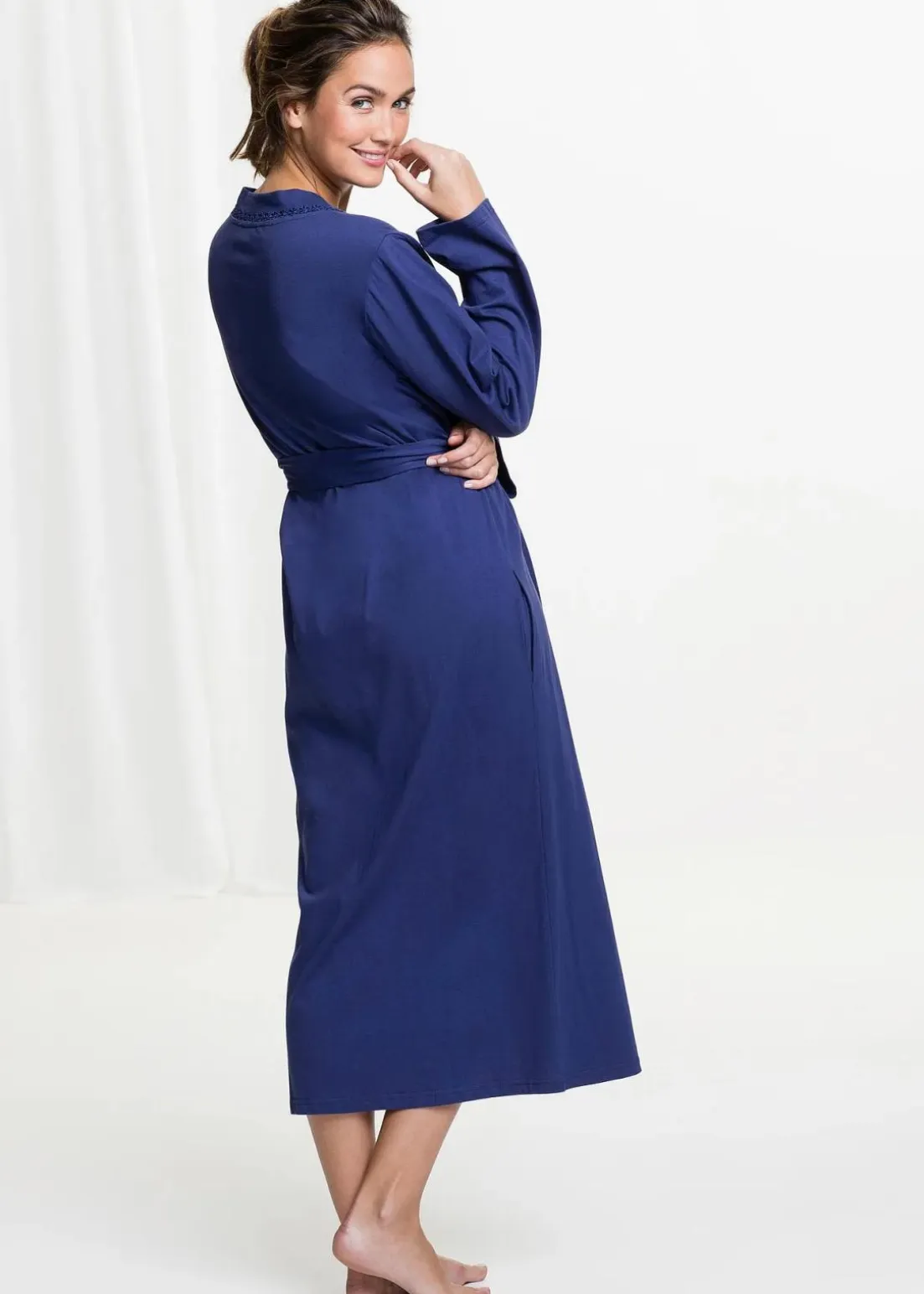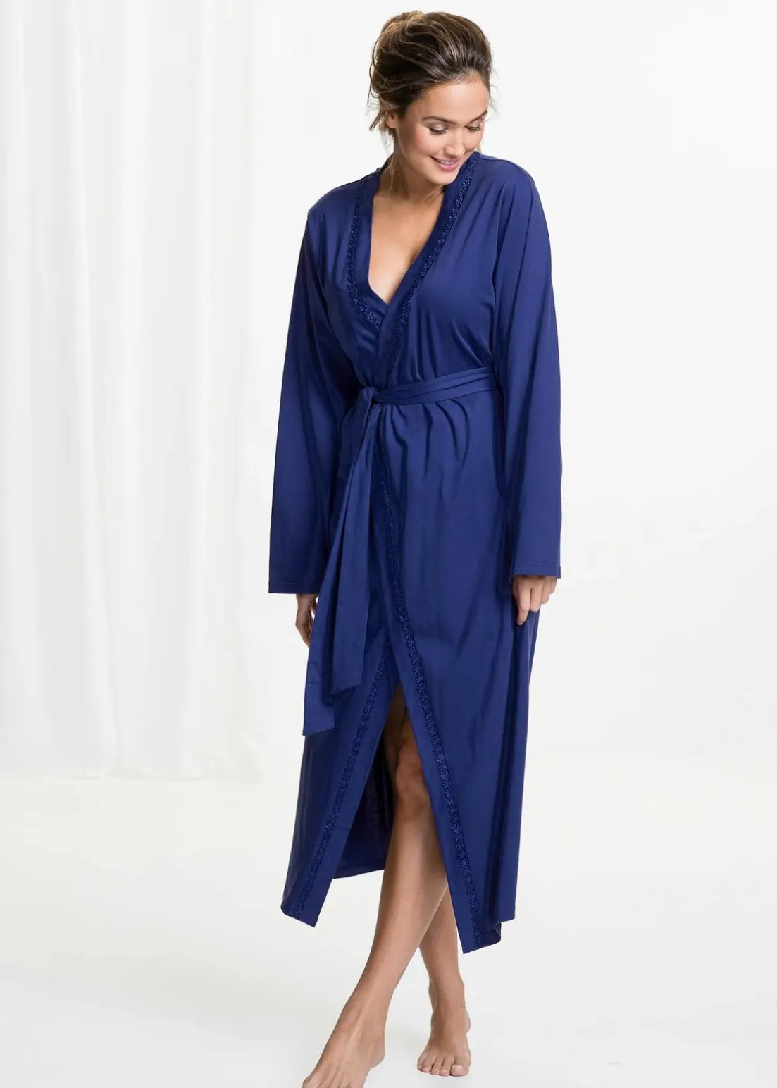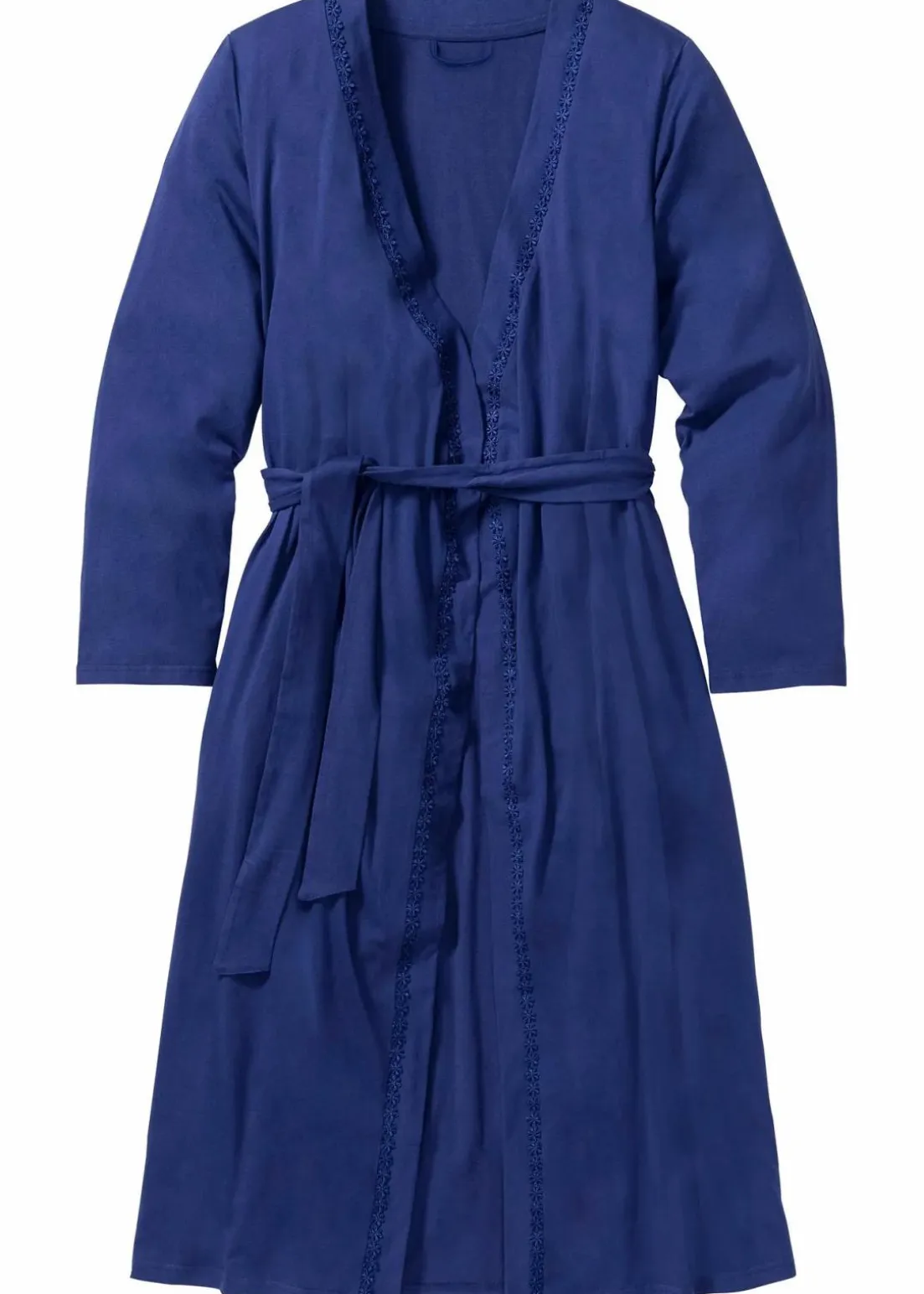 Der bequeme Jersey-Morgenmantel der Marke bpc lässt sich angenehm beim Saunen oder als Loungewear über dem Pyjama tragen. Das softe Material aus Baumwolle fühlt sich wunderbar auf der Haut an. Entlang des Schalkragens bis hinunter zum Saum ist der Bademantel mit einer Zierkante aus Blüten besetzt.Mit dem Bindeband lässt sich das Modell fixieren. Die zwei Eingrifftaschen an den Seiten machen das komfortable Design komplett.