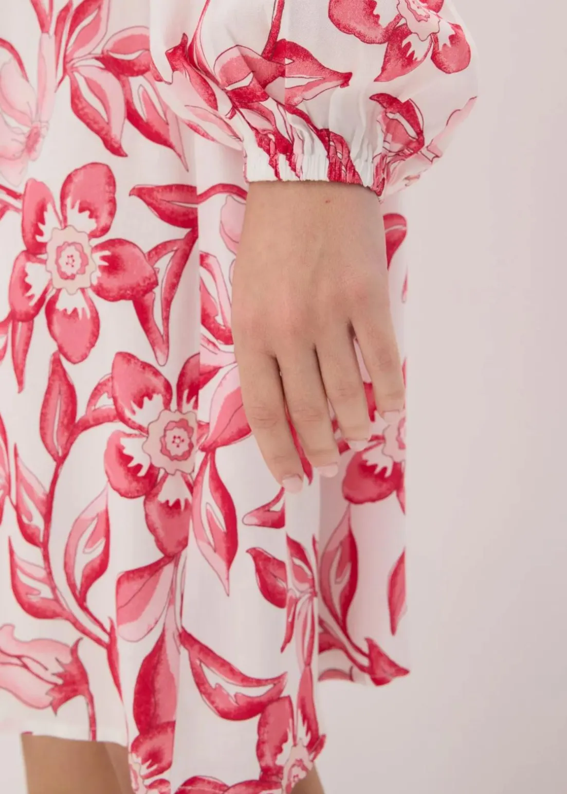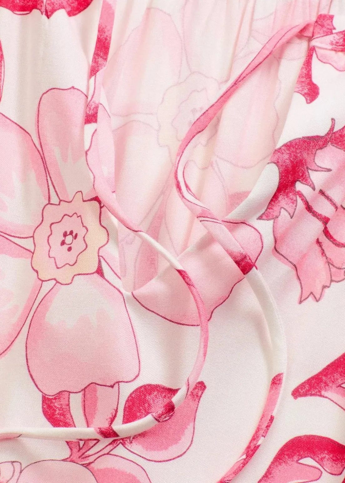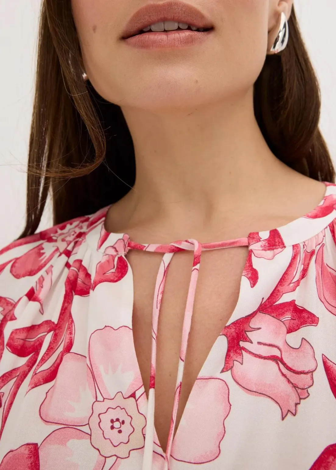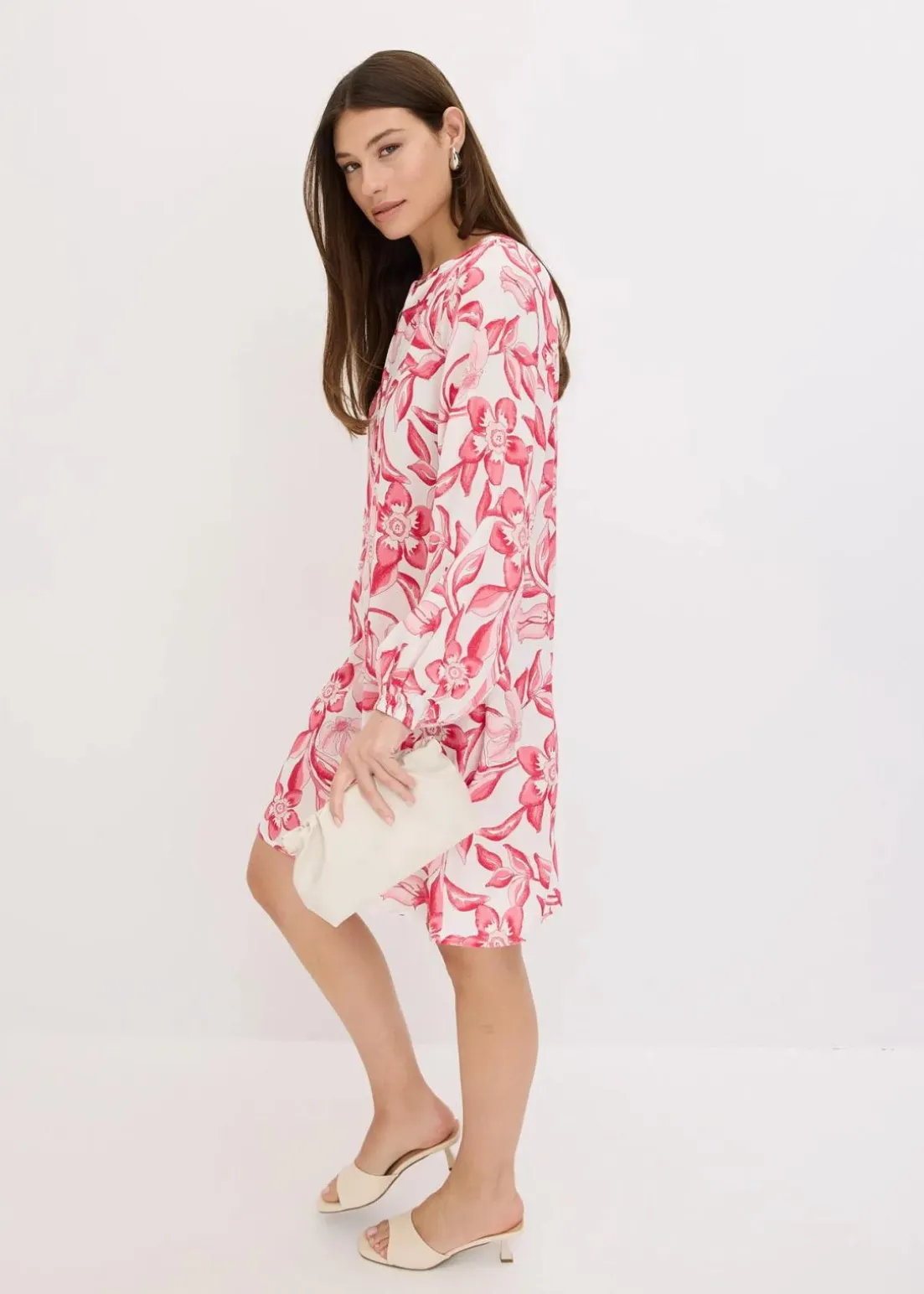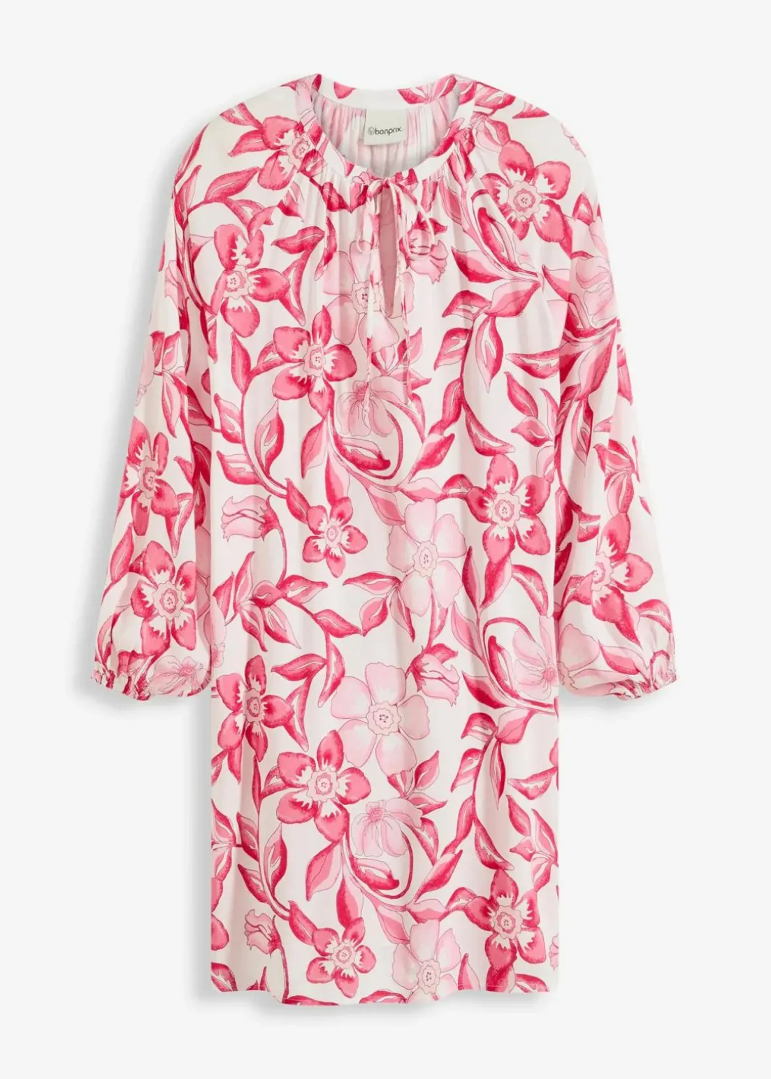 kurzes Tunika-Kleis aus fließender Viskose mit floralem Print und Bindeband am Ausschnitt vorn