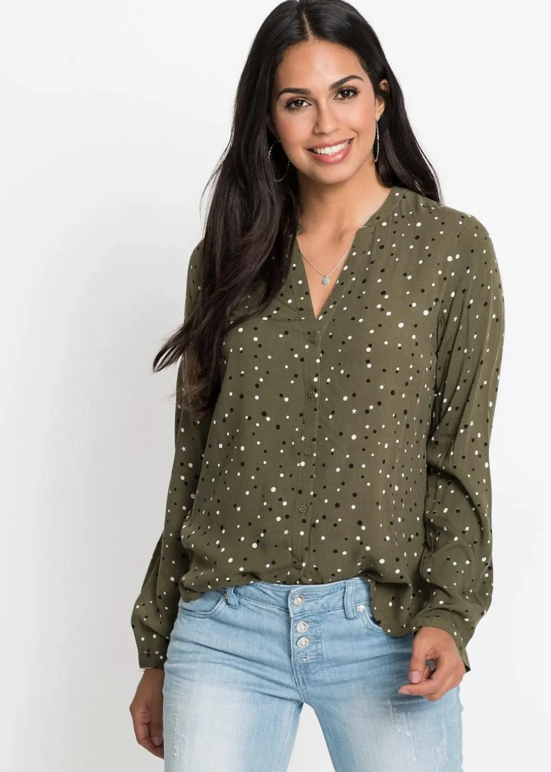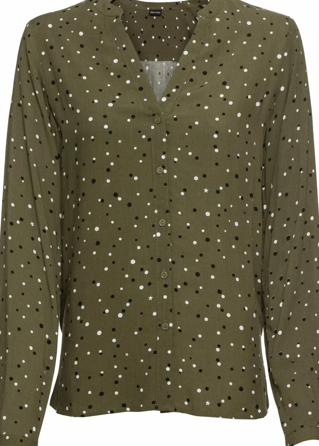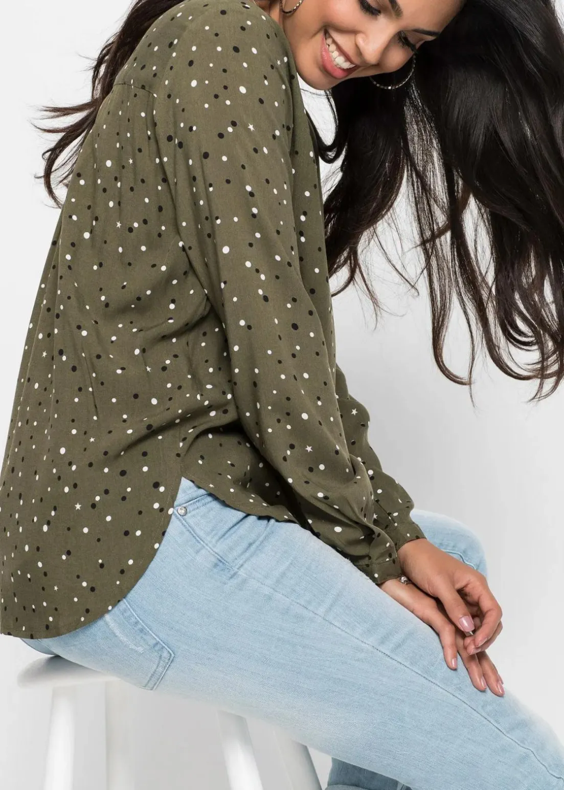 Attraktive Pünktchenbluse mit Knopfleiste und reizendem V-Ausschnitt.