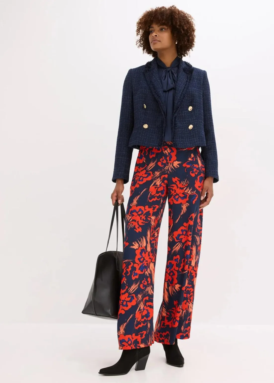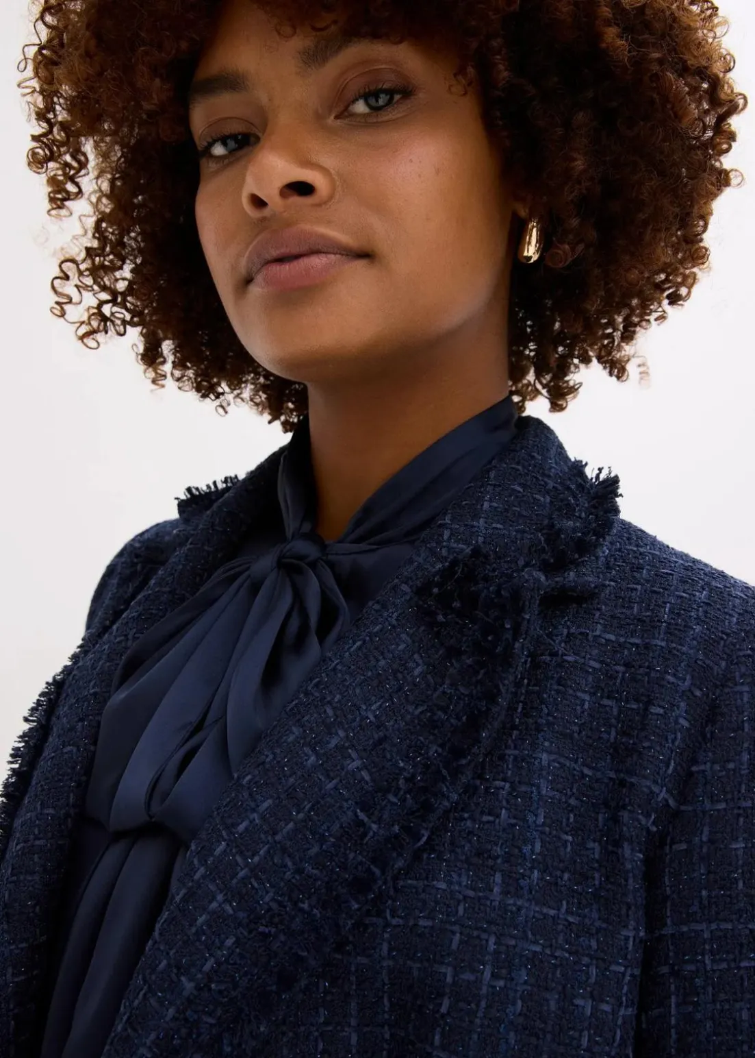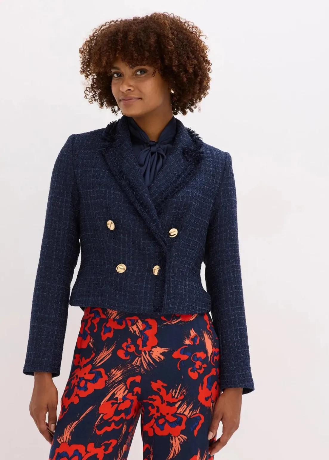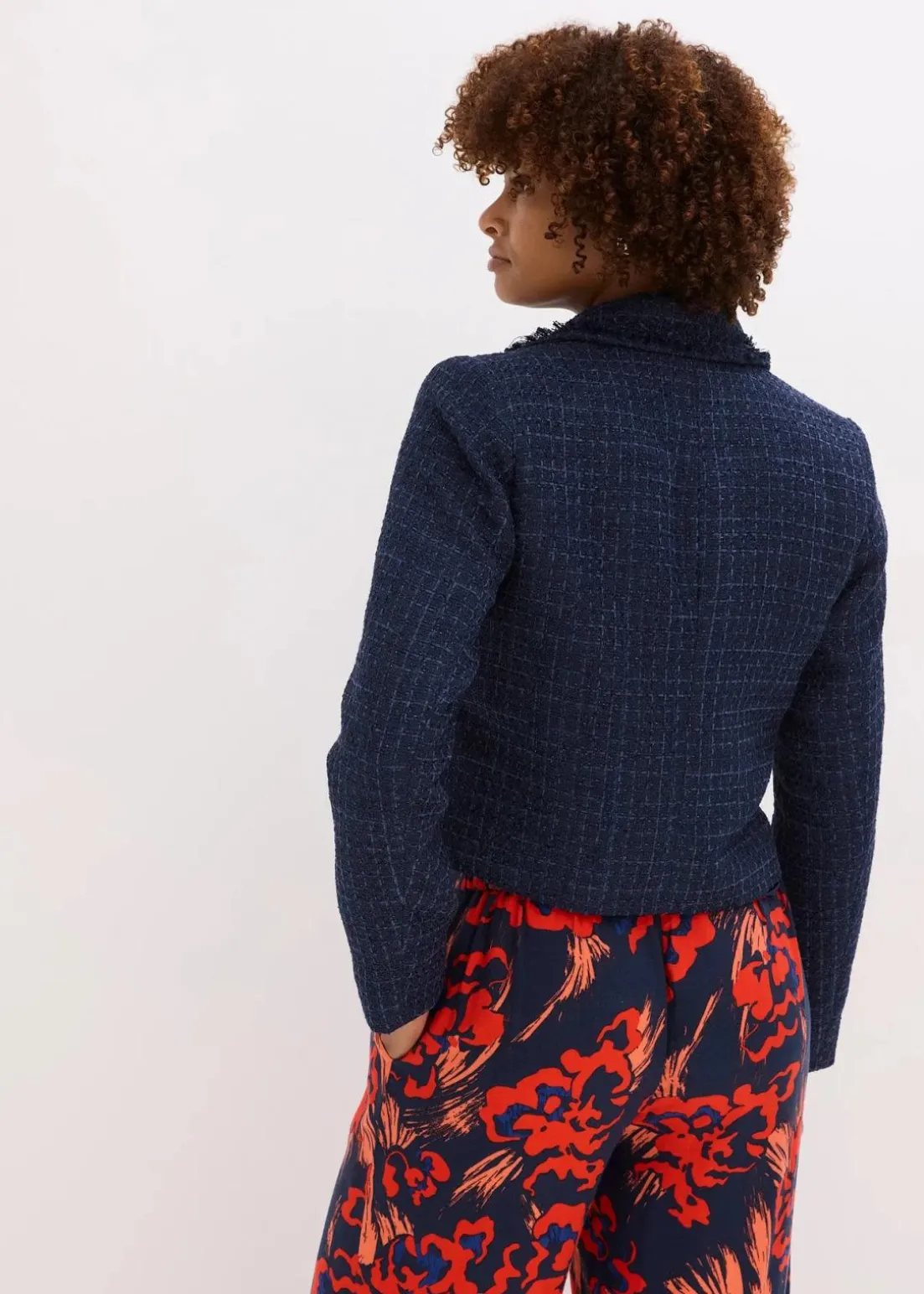 verkürzter Bouclé-Blazer mit dekorativen goldfarbenen Metall-Knöpfen und kleiner Fransenkante am Revers