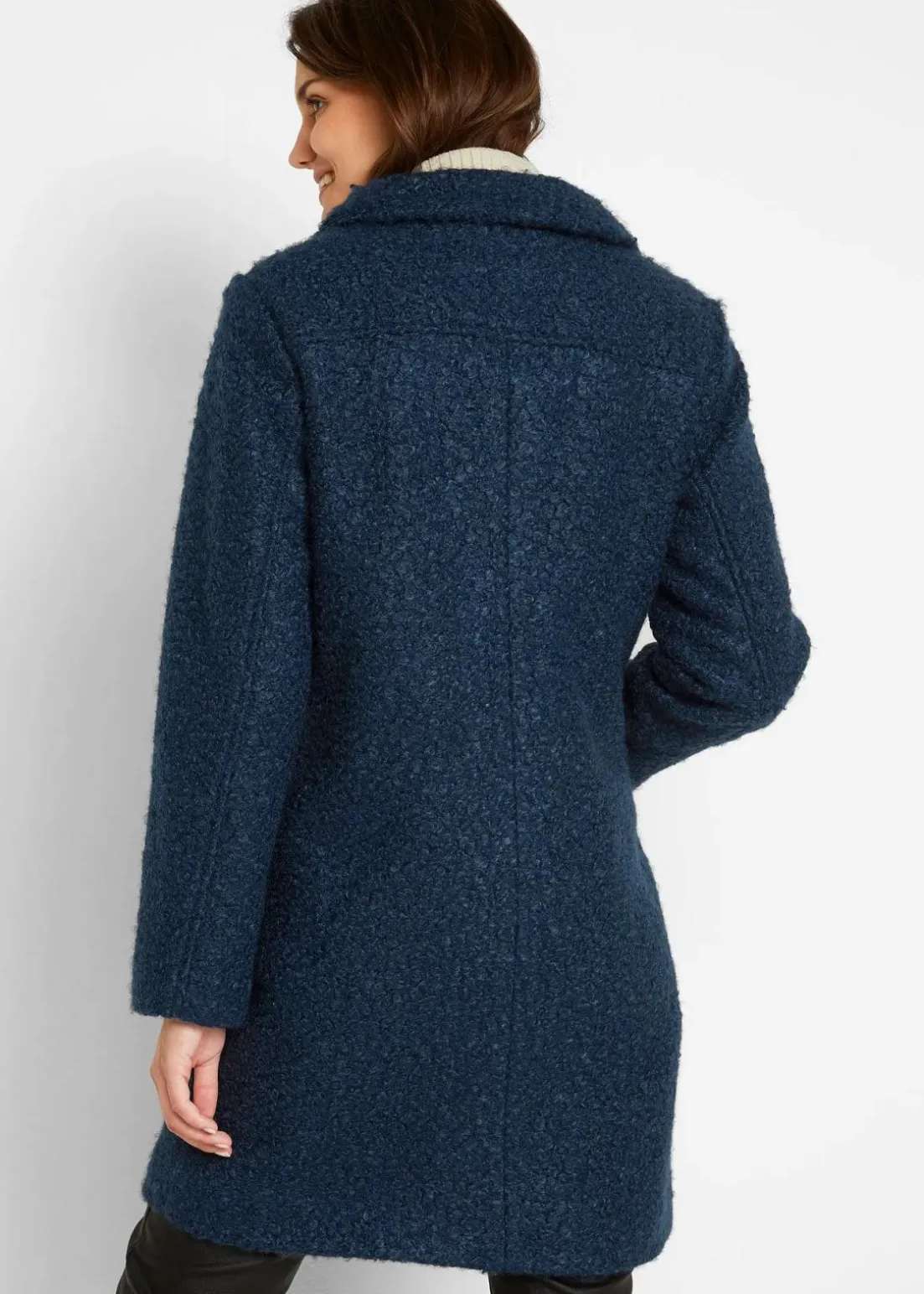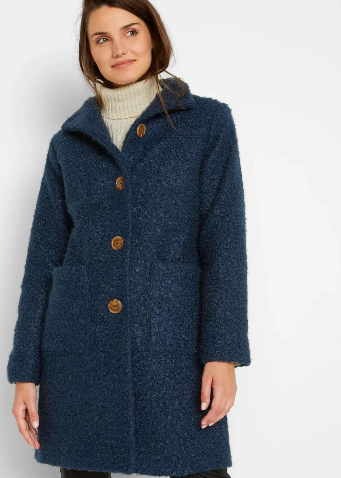 Strukturierter Mantel mit Knopfleiste und Stehkragen, figurumspielend in A-Linie