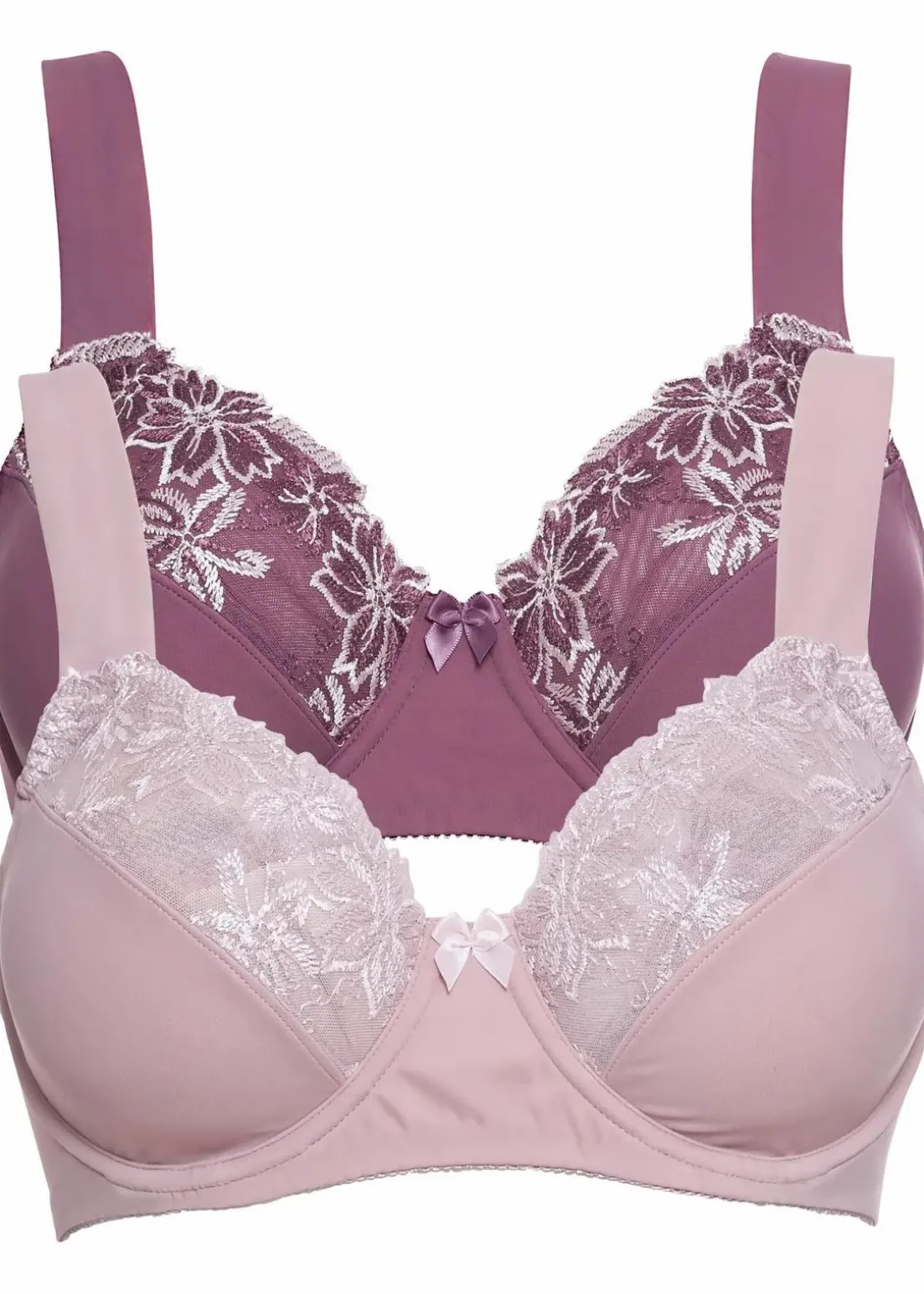 Gleich doppelt wird der schöne BH geliefert. Die attraktive Stickerei im oberen Bereich des Cups umrahmt das Dekolleté besonders charmant. Die Schultern erfahren durch die gepolsterten Träger eine angenehme Entlastung, der BH hat zudem eingearbeitete Bügel.
