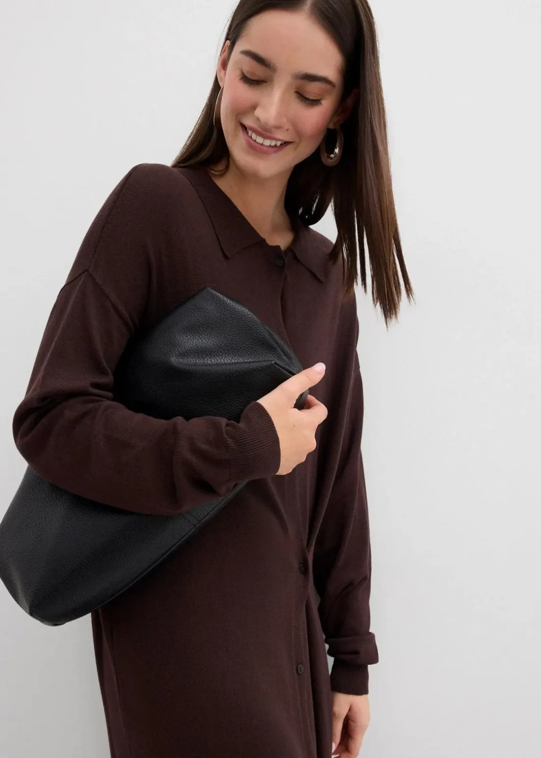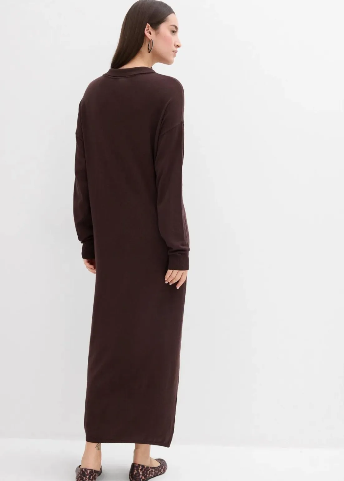 Feinstrickkleid mit einem offenen Kragen, langen Ärmeln und einer Knopfleiste vorne