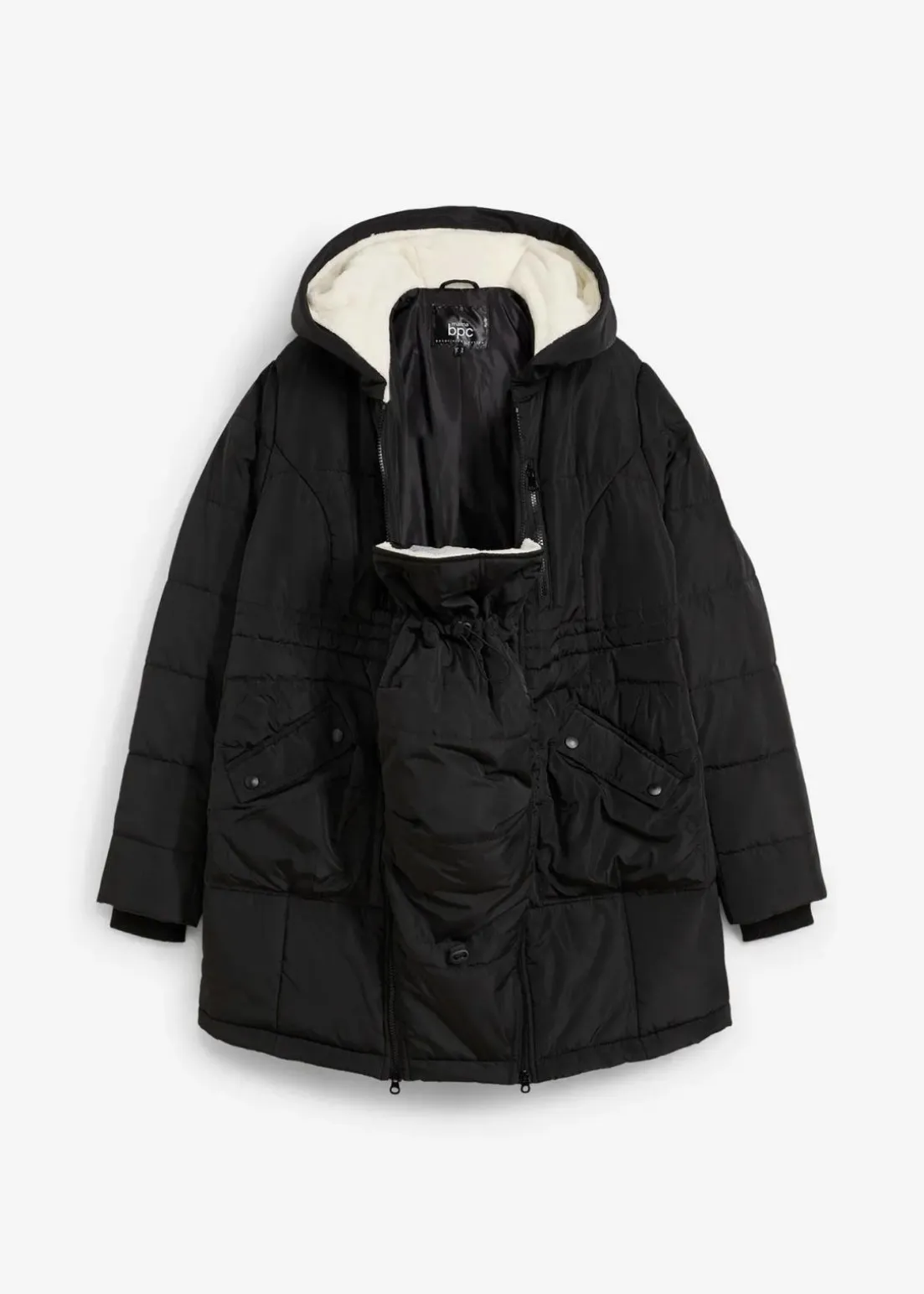 Diese gefütterte Umstandsjacke mit Baby-Einsatz hält Mutter und Baby an kalten Tagen schön warm. Während der Schwangerschaft bieten seitliche Reißverschlüsse viel Raum für den wachsenden Bauch. Nach der Geburt lässt sich das Modell mit einem mit Teddyfell gefütterten Baby-Einsatz erweitern. Dieser dient nur zum Schutz, nicht als Tragefunktion.Die wattierte Jacke überzeugt mit flexiblen Rippbündchen an den Ärmelabschlüssen und mit weichem Teddyfellfutter.