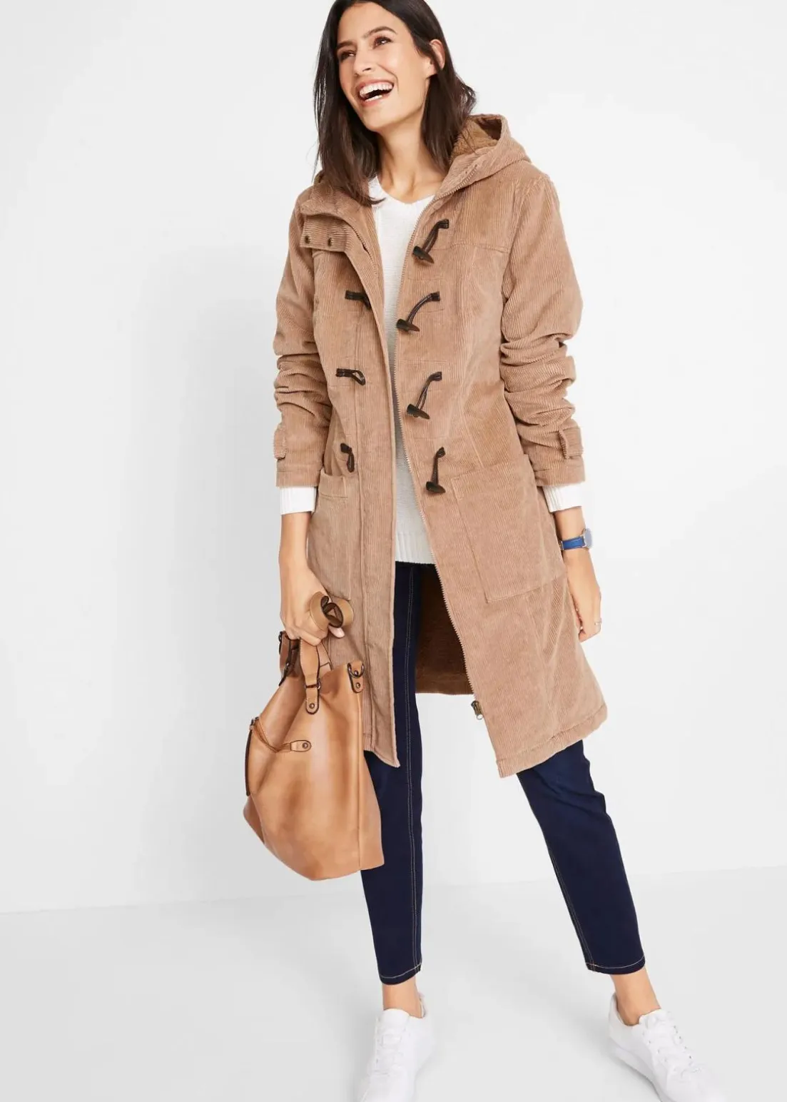 Gefütterter Cord-Dufflecoat mit Kapuze und Knebelknöpfen