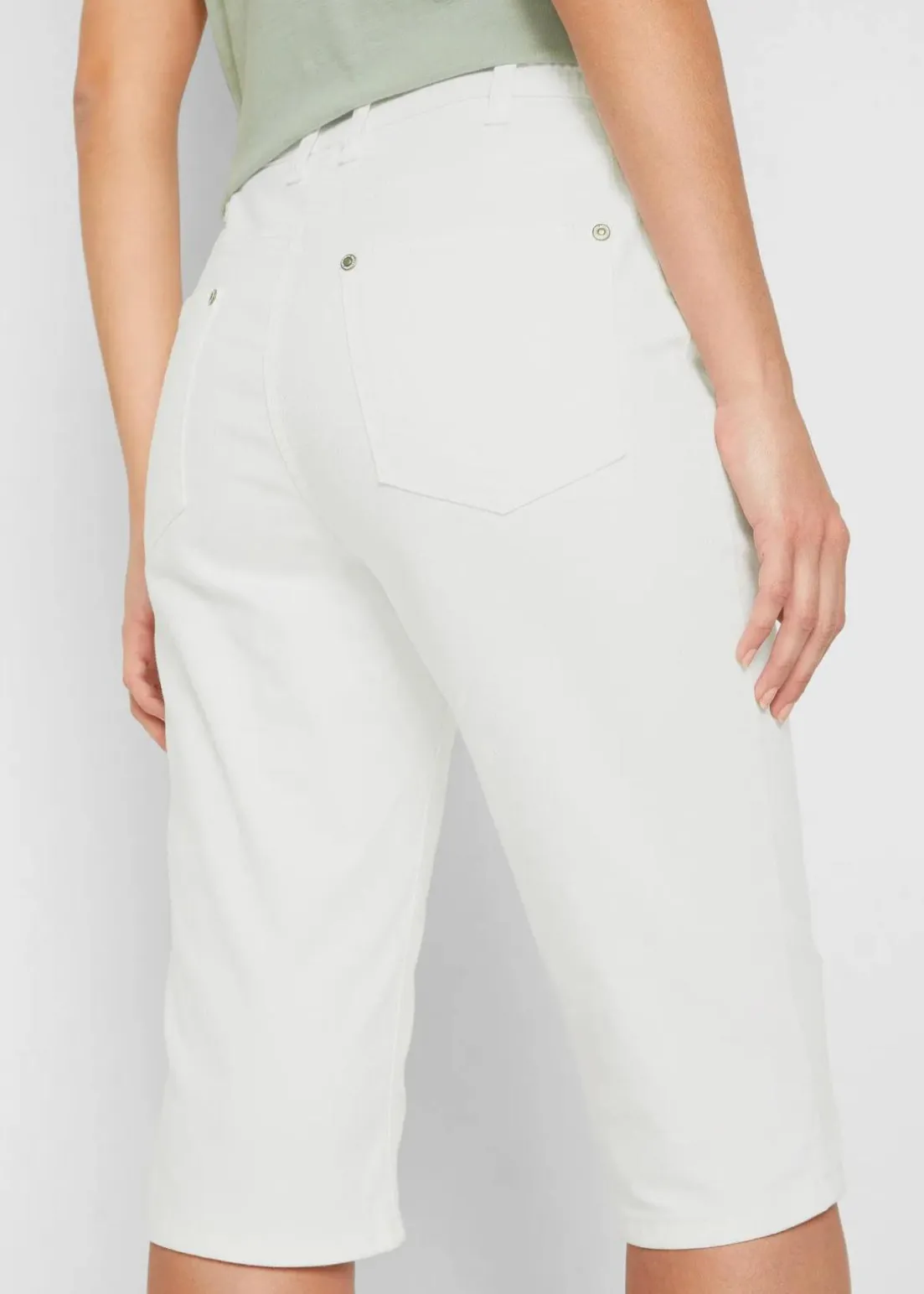 Die bequeme Stretchjeans-Bermuda von bpc ist ein vielseitiges Modeteil. Dank des hohen Teilgummibundes und des praktischen Verschlusses mit Knopf und Zipper trägt sich das Modell sehr komfortabel. Dekoratives Detail der Hose im Five-Pocket-Stil mit Gürtelschlaufen ist der hochgeschlagene Beinabschluss. Der dehnbare Stoff sorgt für einen angenehmen Sitz der figurnahen Bermuda.