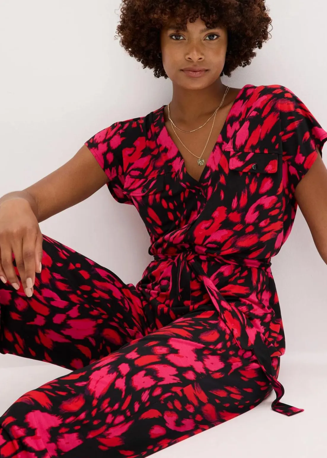 modisch bedruckter Jersey-Jumpsuit mit V-Ausschnitt
