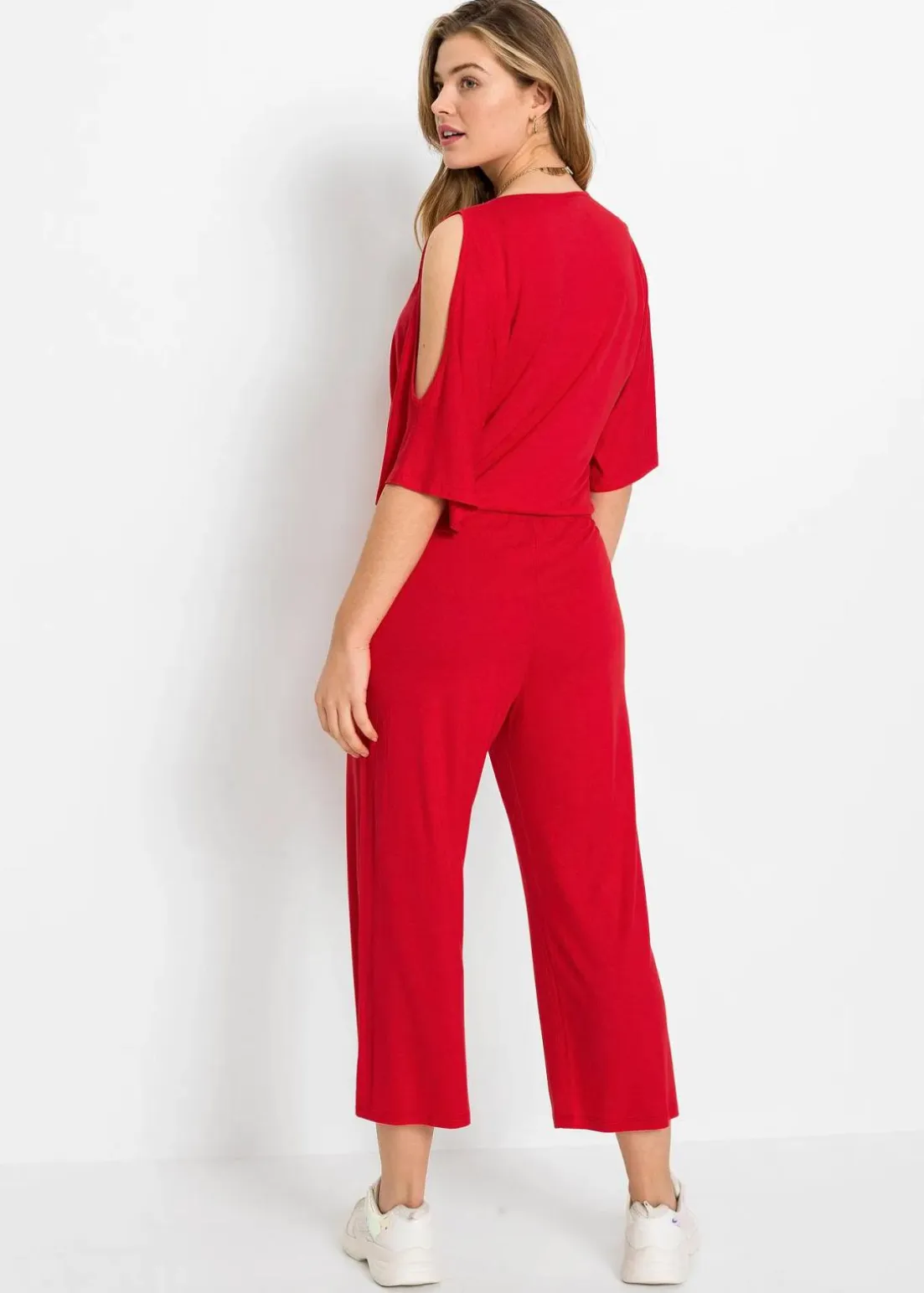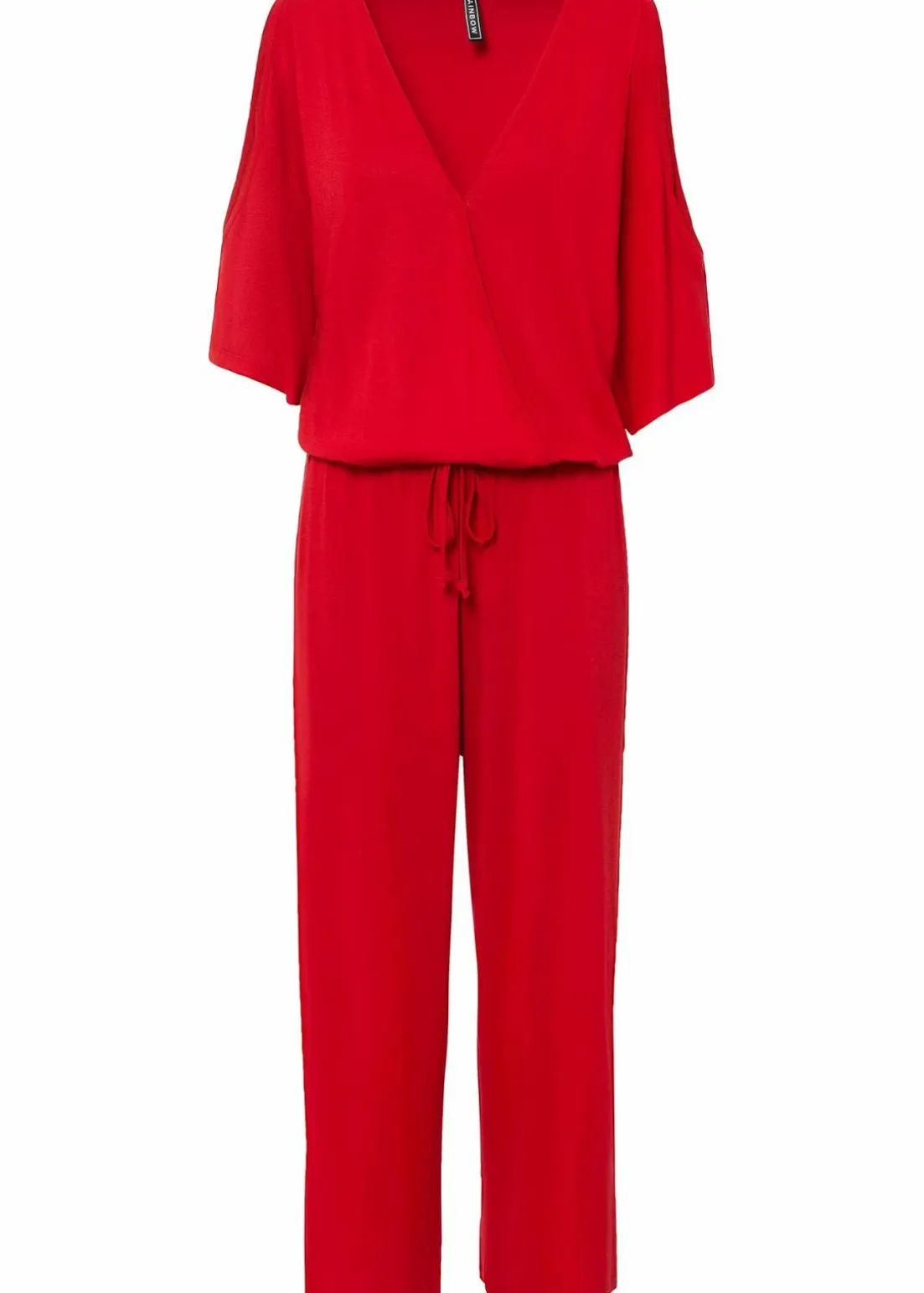 Dieser aufregende Jumpsuit mit weitem Bein in 7/8-Länge erhält mit einem elastischen Taillengummizug eine feminine Silhouette. Der obere Teil begeistert mit einer Wickeloptik, die einen V-Ausschnitt erzeugt, und großzügigen Cut-Outs an der Oberseite der halblangen Kimono-Ärmel. High Heels und Statement-Schmuck setzen den trendy Jumpsuit am Abend großartig in Szene. Tagsüber sorgen Ballerinas oder Espadrilles und Muster-Accessoires für einen coolen Touch.