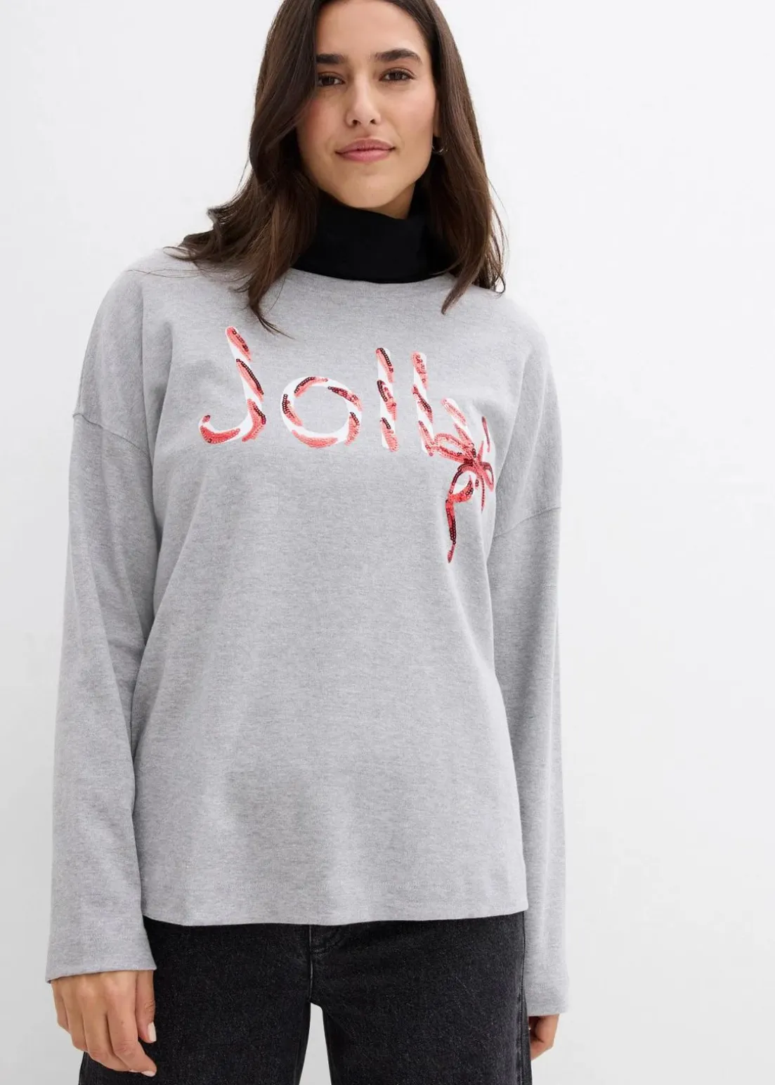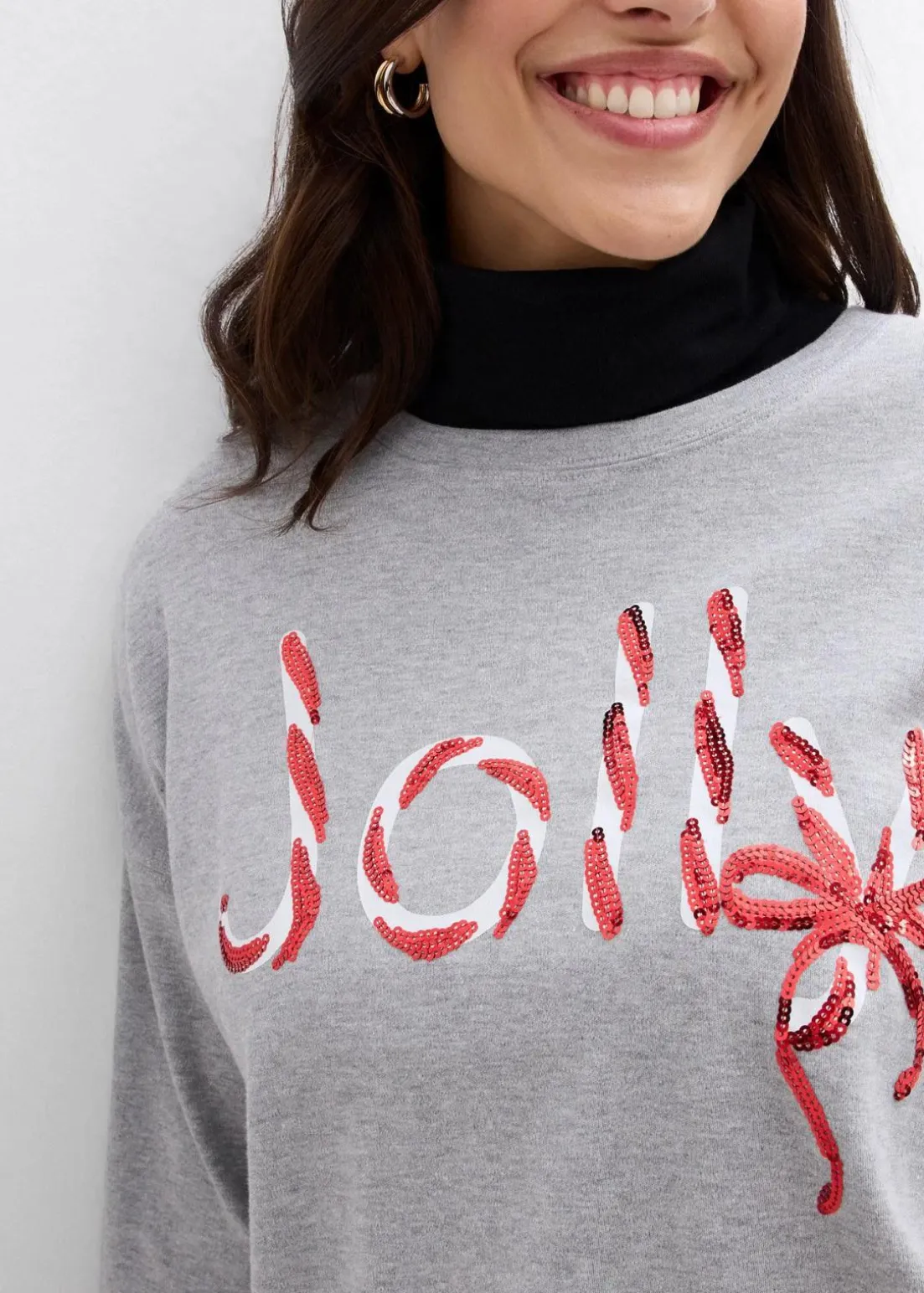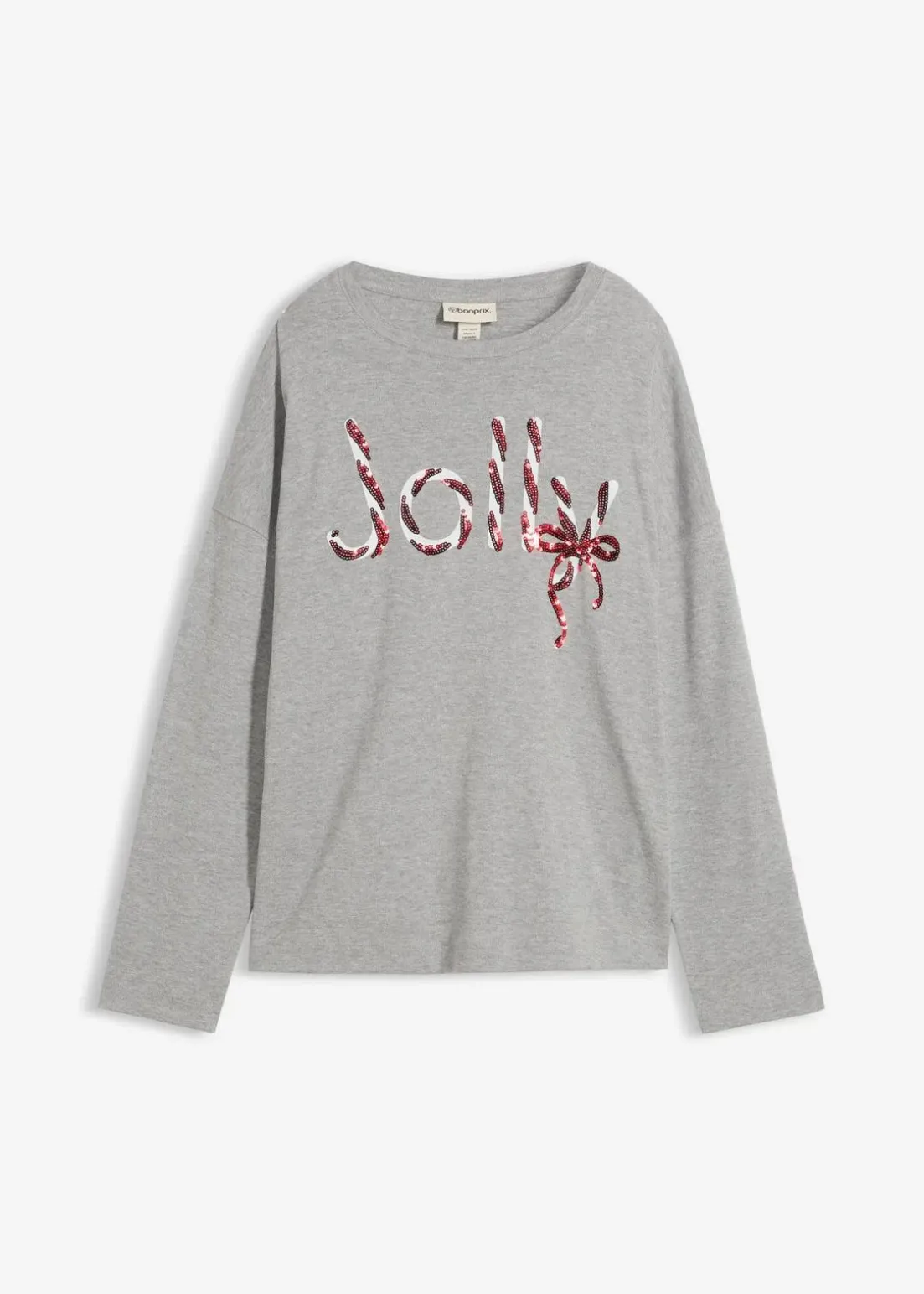 Weihnachtliches Baumwoll-Longsleeve mit Rundhals-Ausschnitt und Pailletten Schriftzug