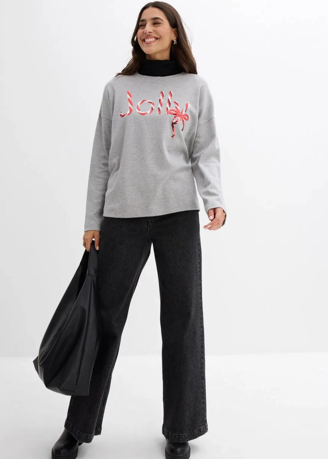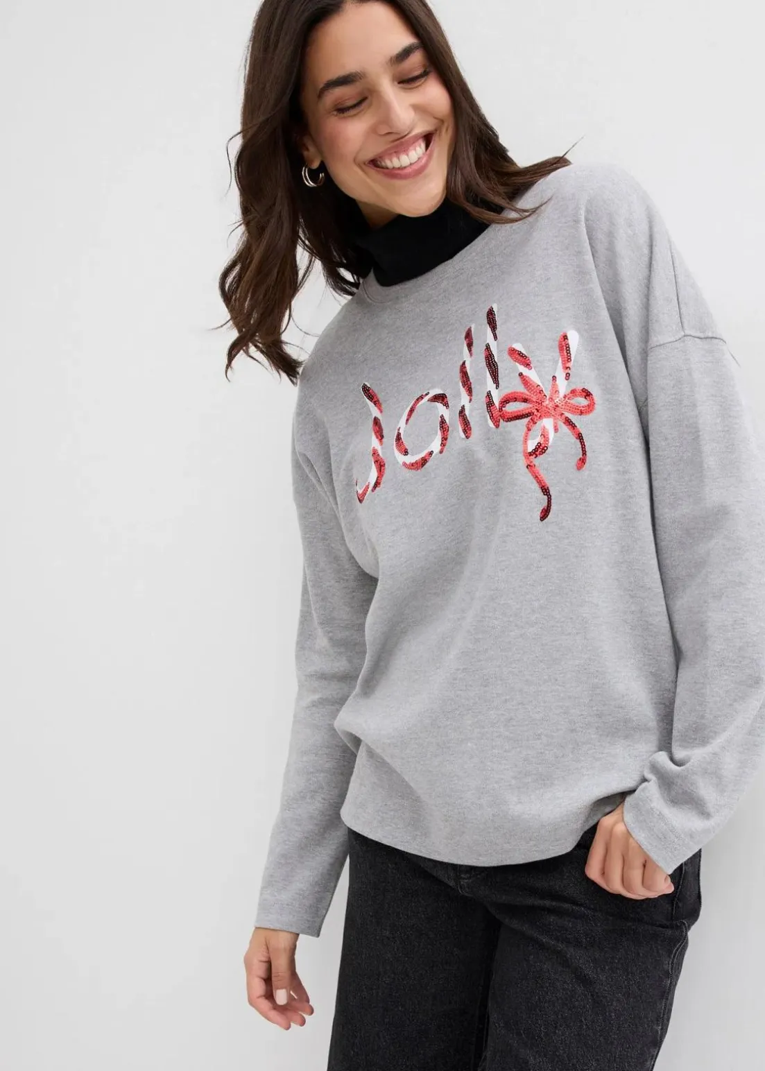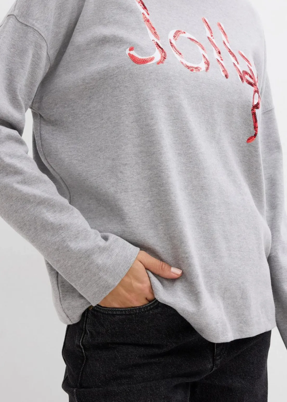 Weihnachtliches Baumwoll-Longsleeve mit Rundhals-Ausschnitt und Pailletten Schriftzug