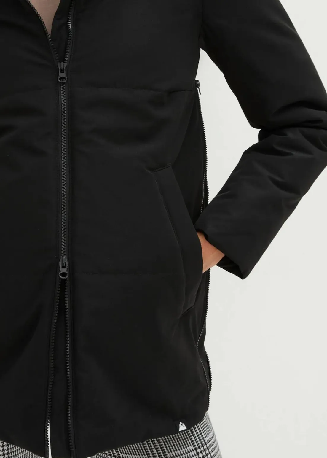 Regen- und windabweisende Funktionsjacke mit einem Trageeinsatz mit kleiner Kapuze für das Baby. Mit Taschen vorne und einer Kordelzugkapuze. Seitliche Reißverschlüsse dienen der Regulierung der Weite, die das Tragen sowohl in als auch nach der Schwangerschaft ermöglichen. Mit Zweiwegereißverschluss.