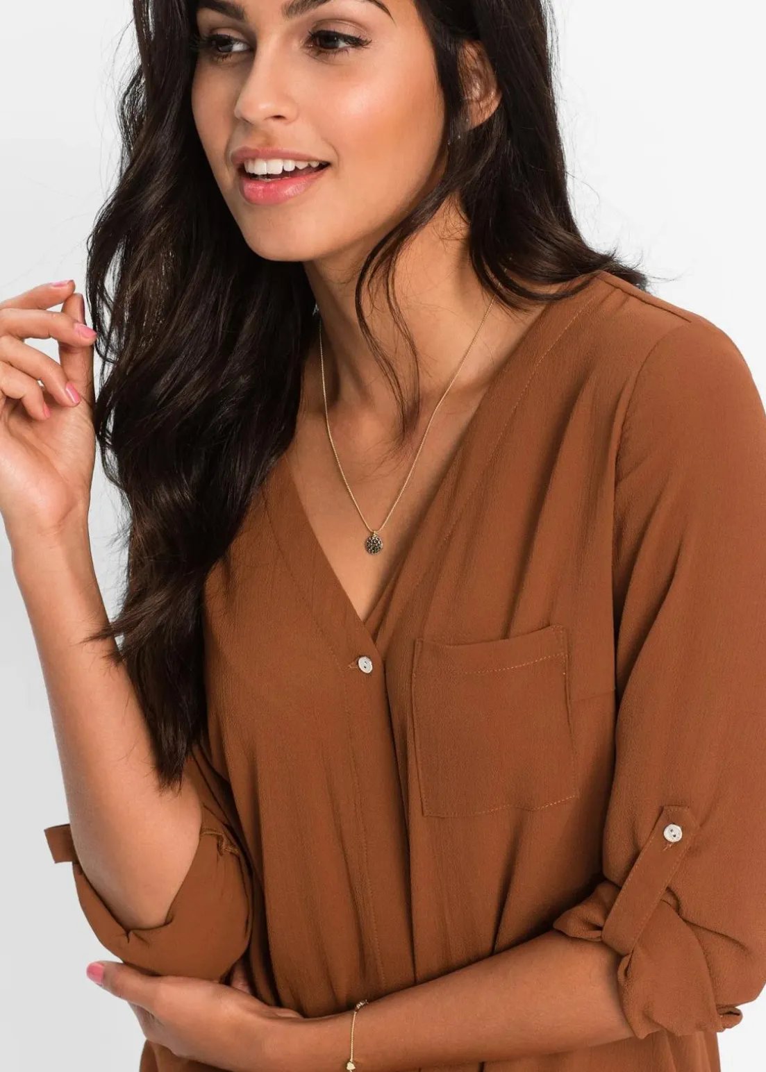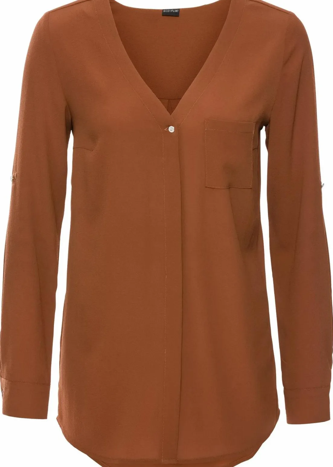 Feminine Longblusemit verdeckter Knopfleiste.