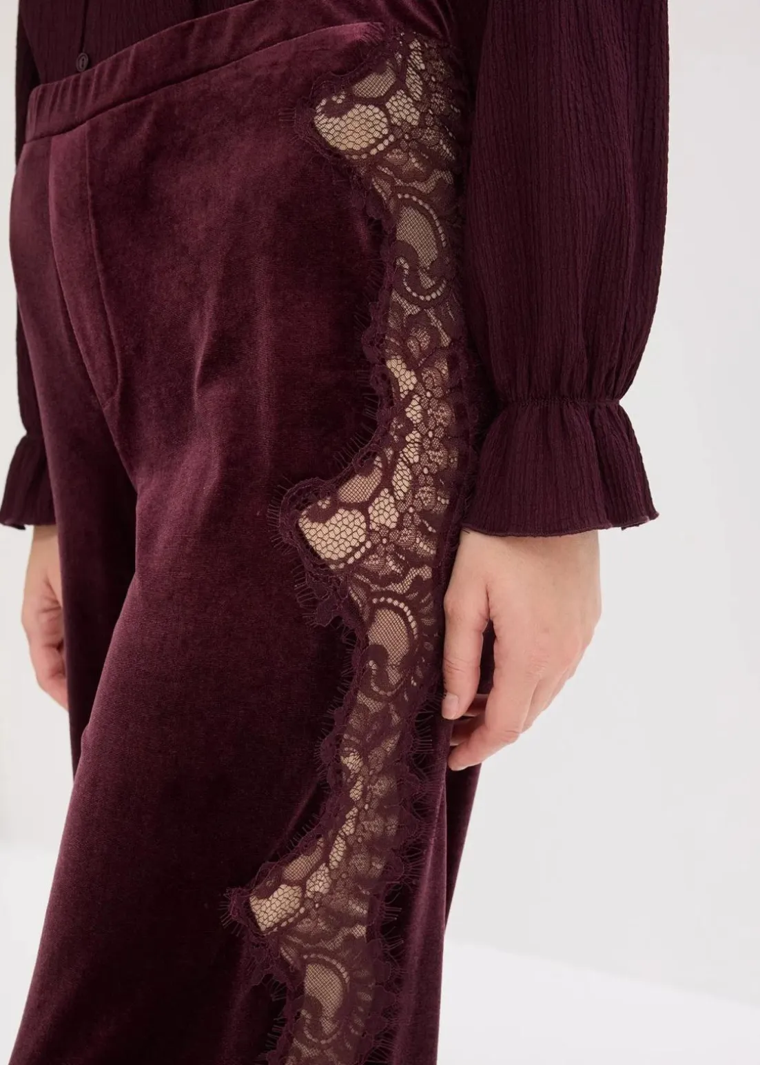 modische Marlenehose aus softem Samt mit dekorativem Spitzeneinsatz an der Seite. Die Spitze ist mit hautfarbenem Mesh unterlegt