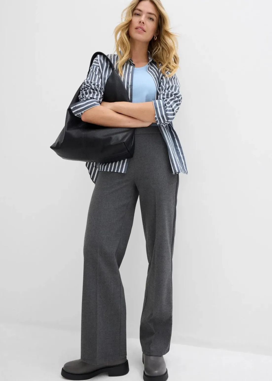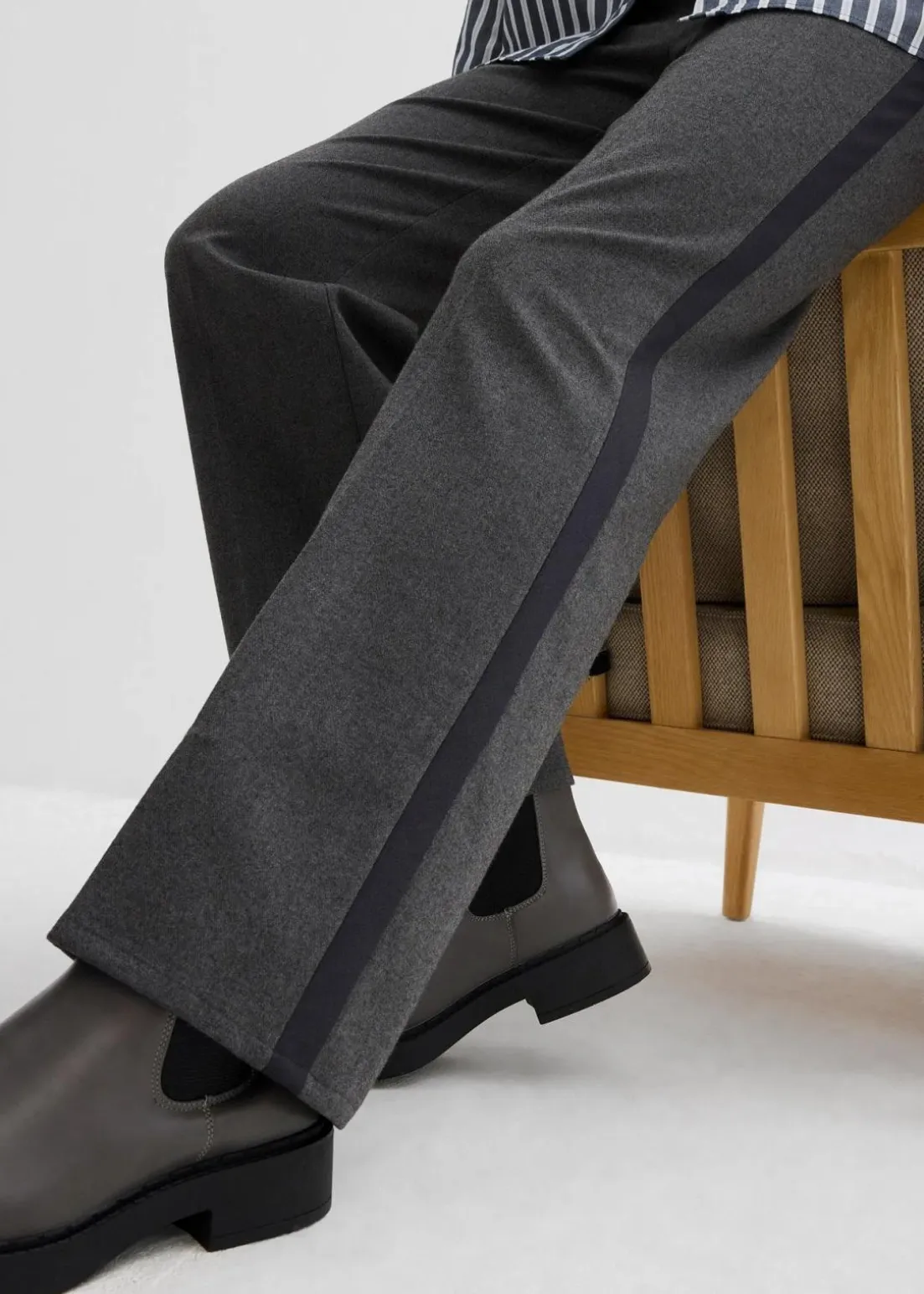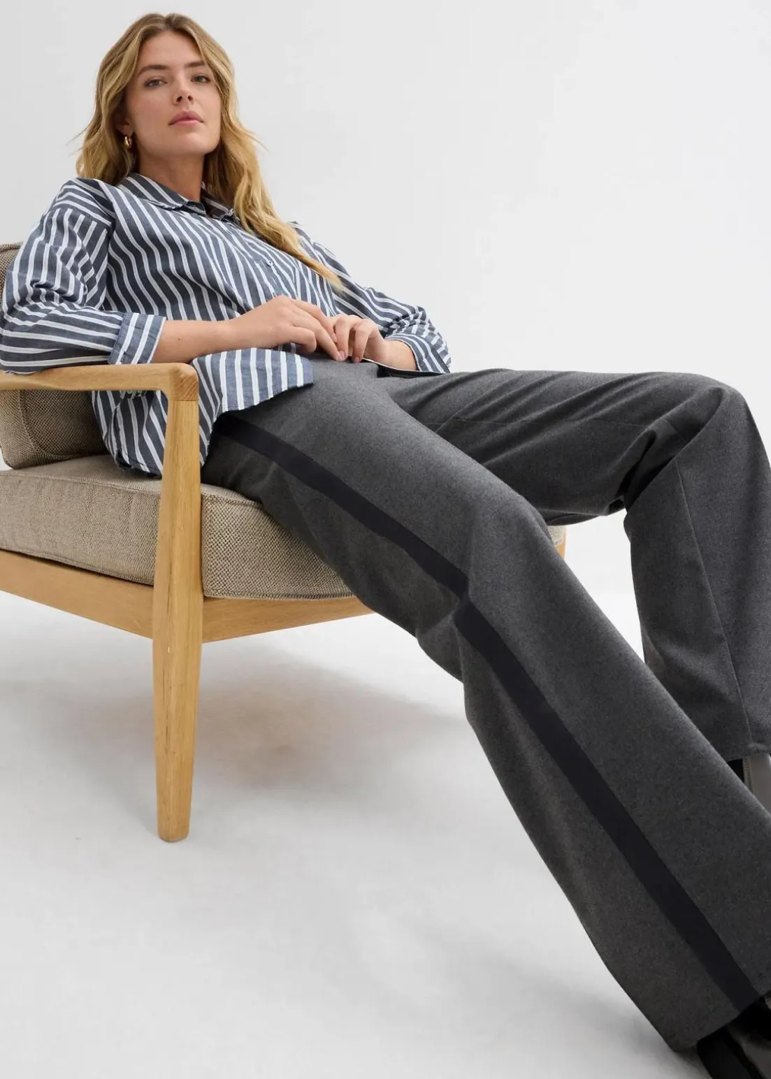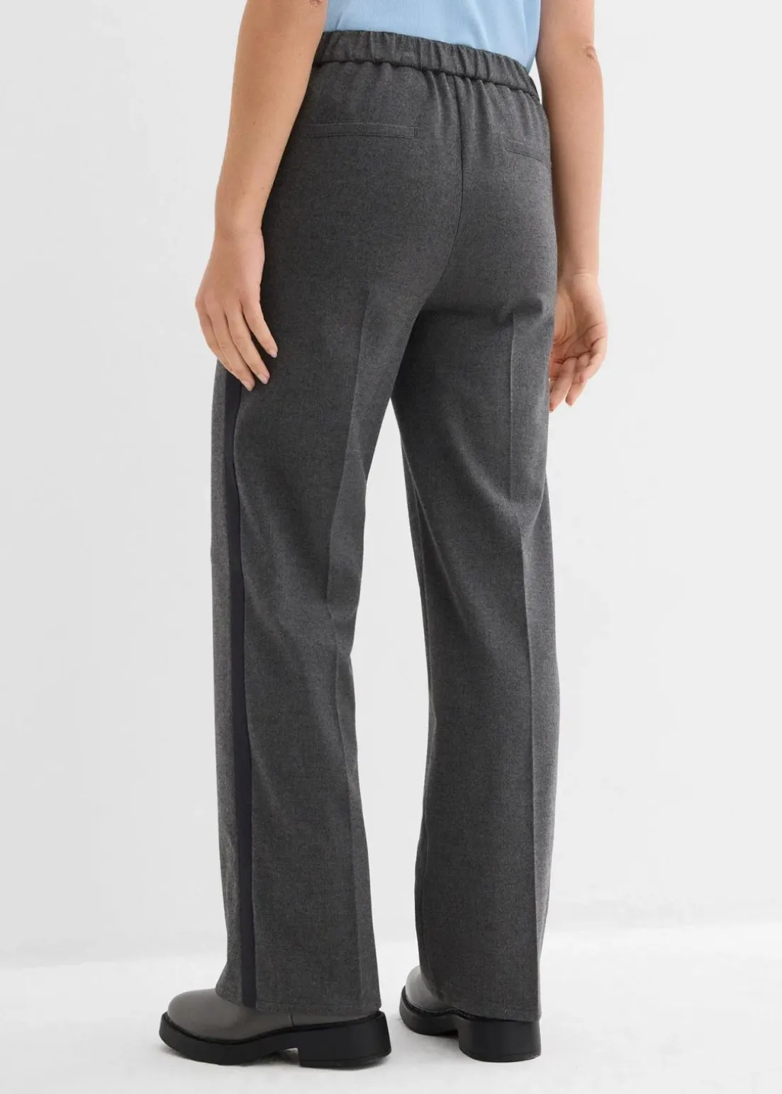 Marlene-Hose mit hoch geschnittenem, teil-elastischem Bund und seitlichem Streifendetail.