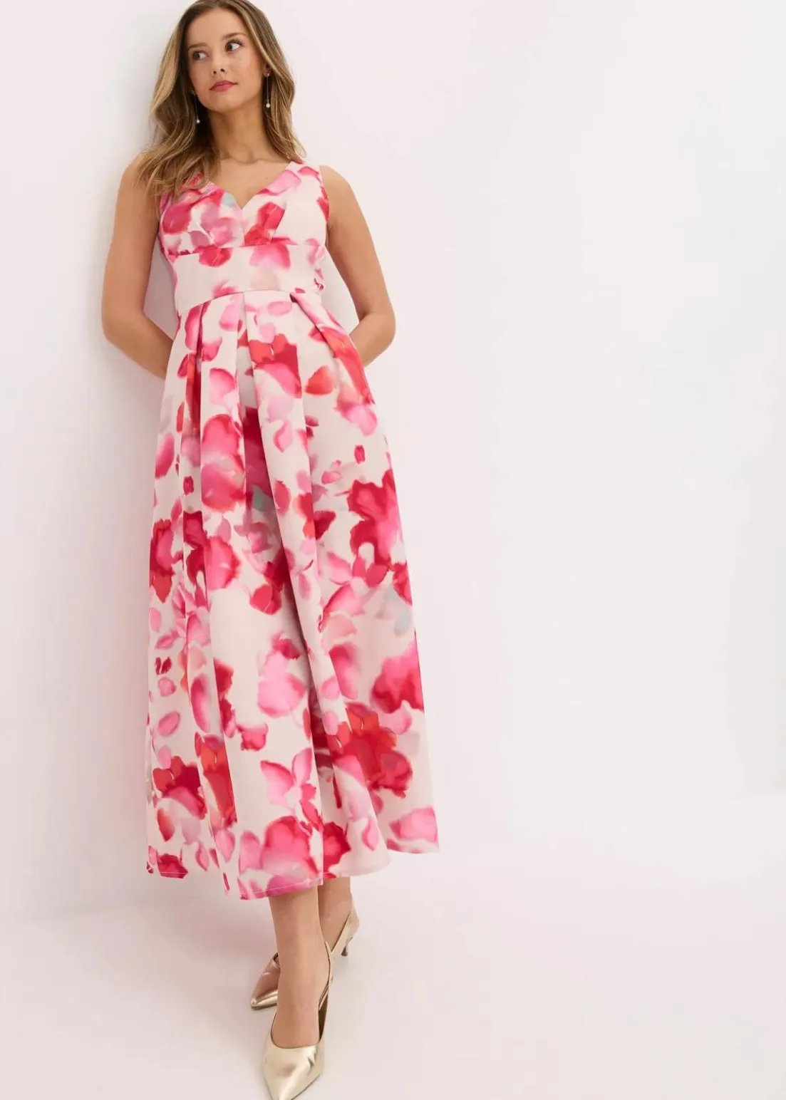 Modern und feminin: Maxikleid mit Taillen-Einsatz und Falten-Rock aus glänzendem Satin mit floralem Print