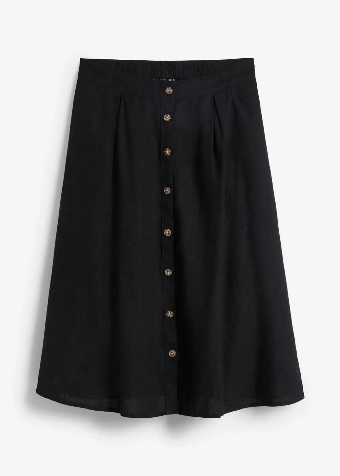 Locker fallender Rock mit Knopfleiste und hinteren elastischem Bund. Die Knöpfe können Farbabweichungen durch die Hornoptik aufweisen.