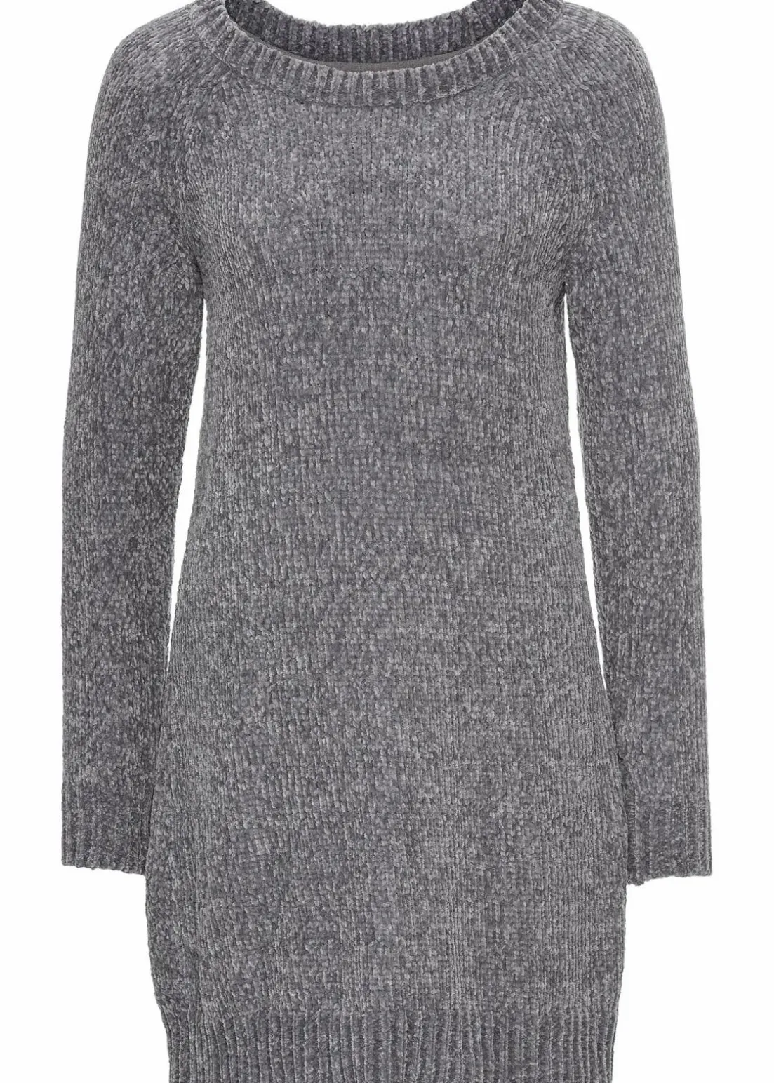 Das Kleid begeistert mit seinem kuscheligen warmen Strick und Bündchen aus Rippe an den Säumen und am Kragen.