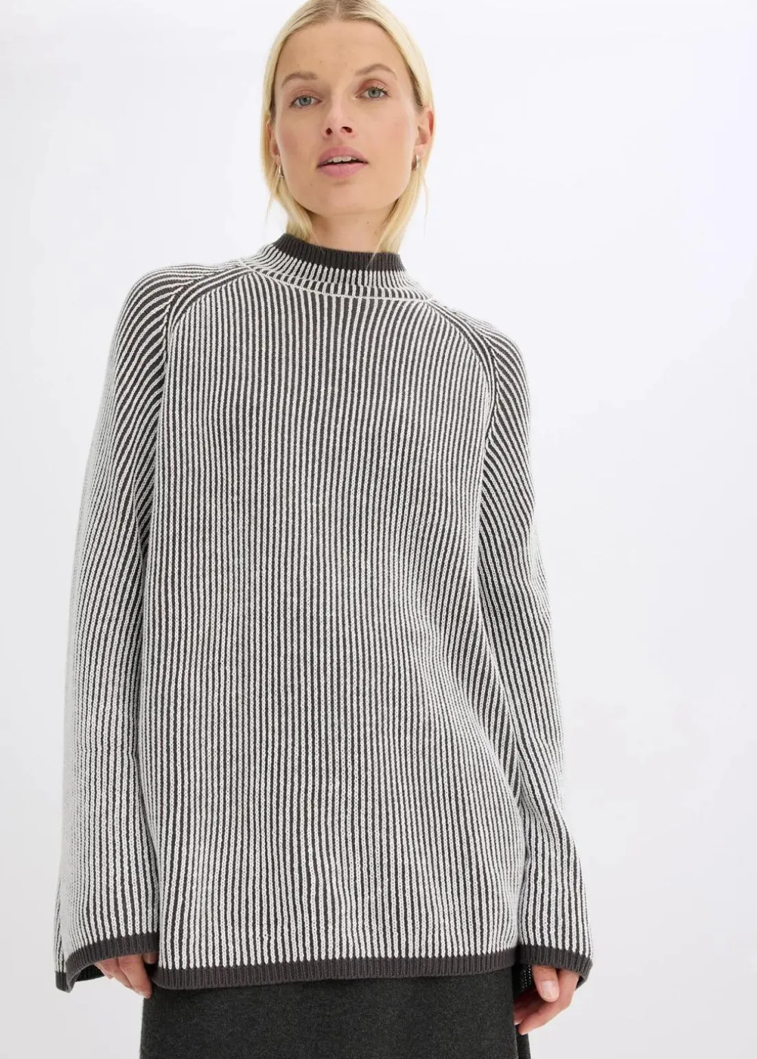 Oversize Grobstrickpullover mit Stehkragen, gestreift