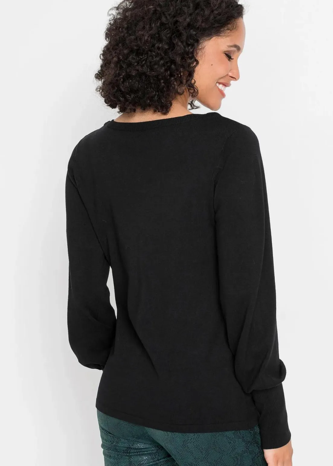 Ob elegant oder leger – dieser attraktive Pullover der Marke BODYFLIRT lässt sich vielseitig kombinieren und ist ein toller Blickfang.Der aparte Pullover zeigt sich mit weiten Ballonärmeln, die am Handgelenk eng zulaufen und mit einem breiten Bündchen abschließen. Der tiefe V-Ausschnitt verleiht dem hüftbedeckenden Pullover mit Ballonärmeln einen ansprechenden Look.