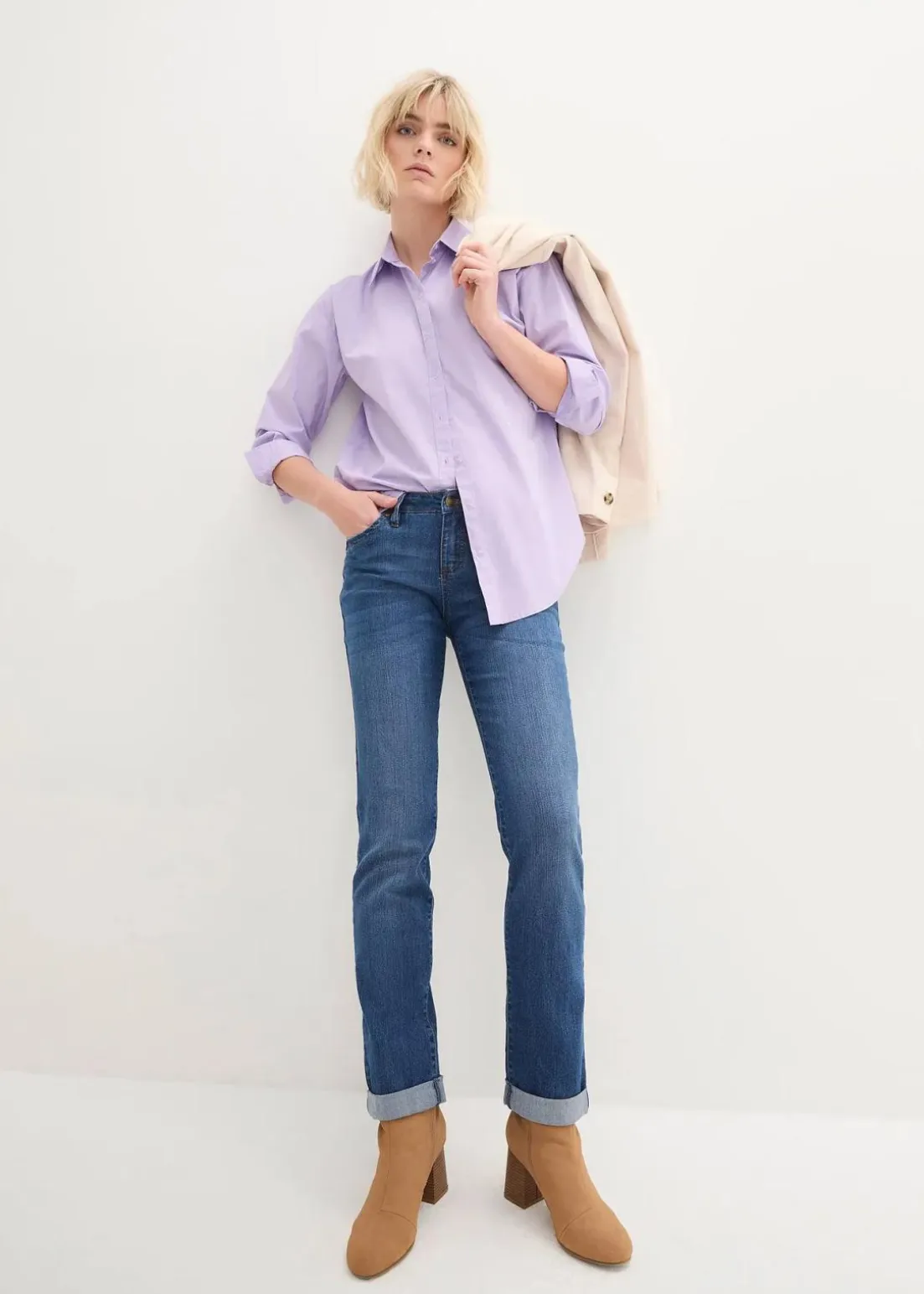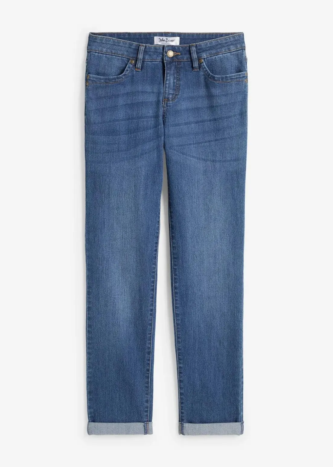 Diese Stretch Jeans Straight aus der Kollektion von John Baner hat das Potenzial zur absoluten Lieblingshose. Gerader Schnitt, lässige Used-Optik – so wird jeder Look zum Hingucker.Beim Kombinieren ist diese Hose vielseitig. Zu locker geschnittenen Blusen und Hemden, hübschen Tuniken und einfachen Basic-Shirts passt sie perfekt. Boots, Sneakers oder Ballerinas dazu – schon ist das Freizeitoutfit komplett.Referenzgröße für Längenangabe: Gr. 42