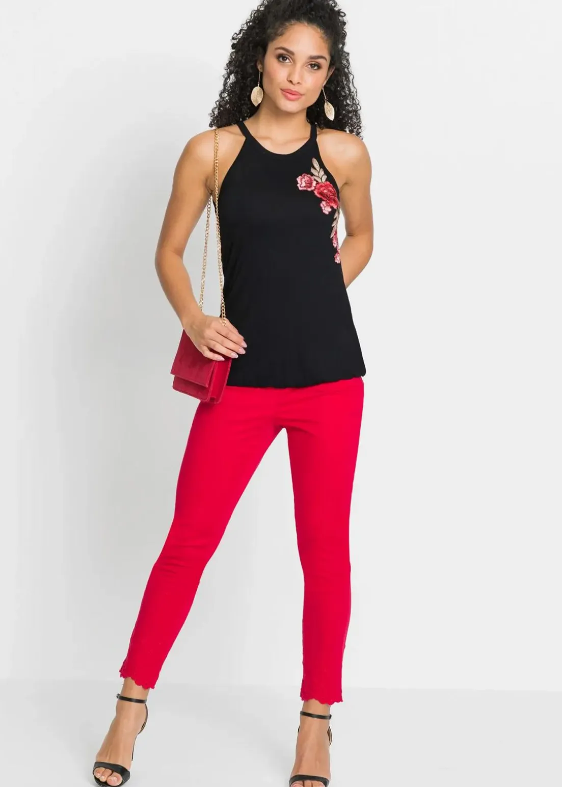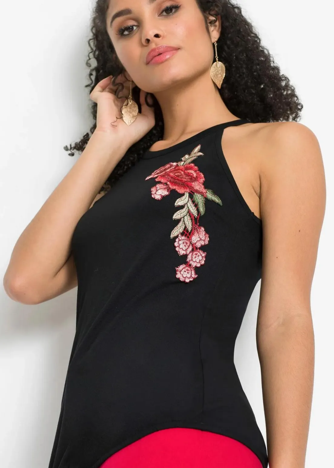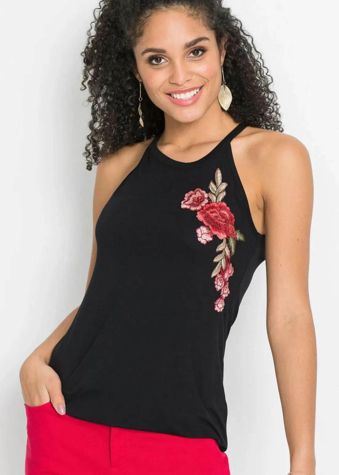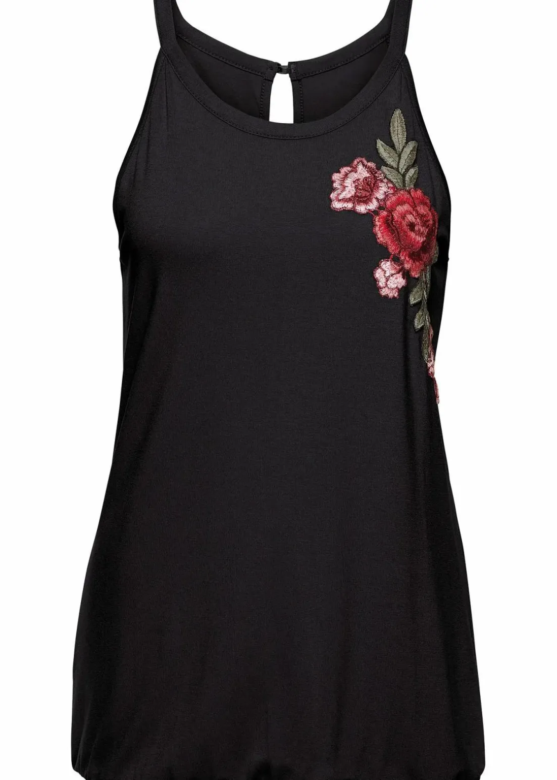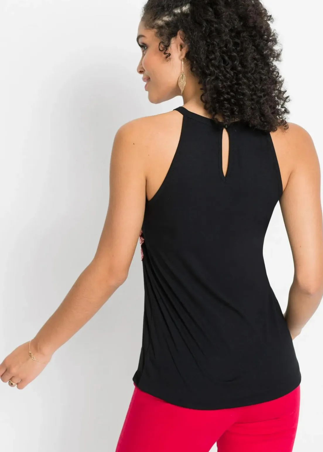 Das Top mit Stickerei präsentiert sich als trendiges Mode-Highlight im Kleiderschrank und darf in der kommenden Saison nicht fehlen. Mit seinem ärmellosen Schnitt betont das Modell attraktiv den Schulter- und Rückenbereich. Auffälliges Detail ist die florale Stickerei vorne. In der Rückenansicht offenbart das Top von BODYFLIRT seine charmante Seite mit einem schönen Cut-Out und einem kleinen Knopfverschluss. Durch das elastische Gummiband unten im Saum schmiegt sich das hüftbedeckende Oberteil schmeichelhaft um die Silhouette.In Kombination mit einer Jeansshorts und Sandaletten entsteht ein modernes Outfit für den Tag.