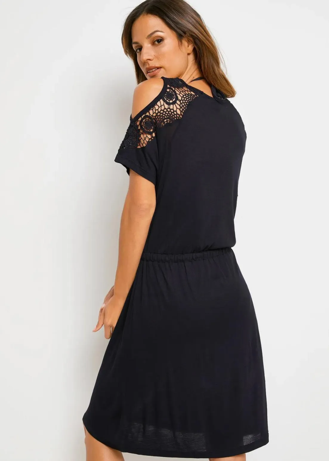 Leicht transparentes Strandkleid mit Gummizug und Bindeband in der Taille.