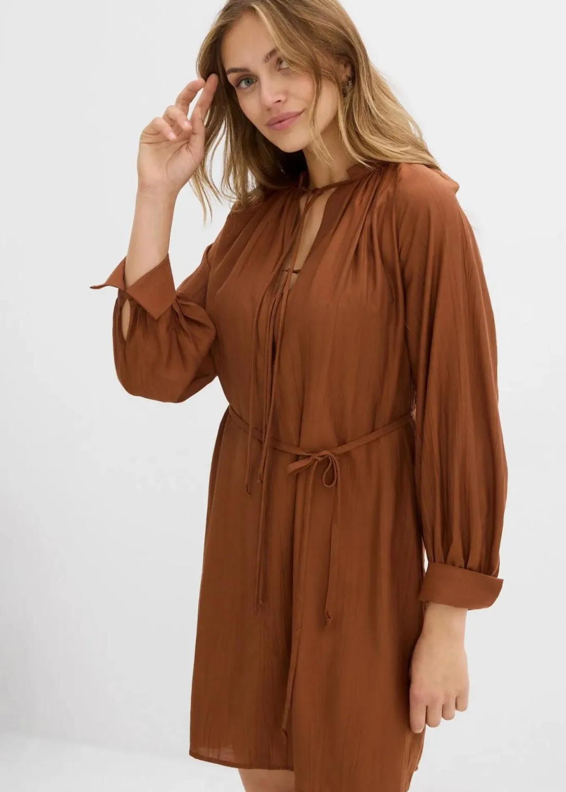 Blusenkleid aus einer hochwertigen Viskose-Mischung. Mit einem Rundhalsausschnitt mit kleinem Stehkragen. Die Ausschnitttiefe lässt sich durch die dekorativen Bindebänder regulieren und dient gleichzeitig als Stillfunktion. Ein abnehmbares Bindeband ermöglicht eine individuelle Weitenregulierung der Taille. Die Raglanärmel sind mit breiten Manschetten verziert.