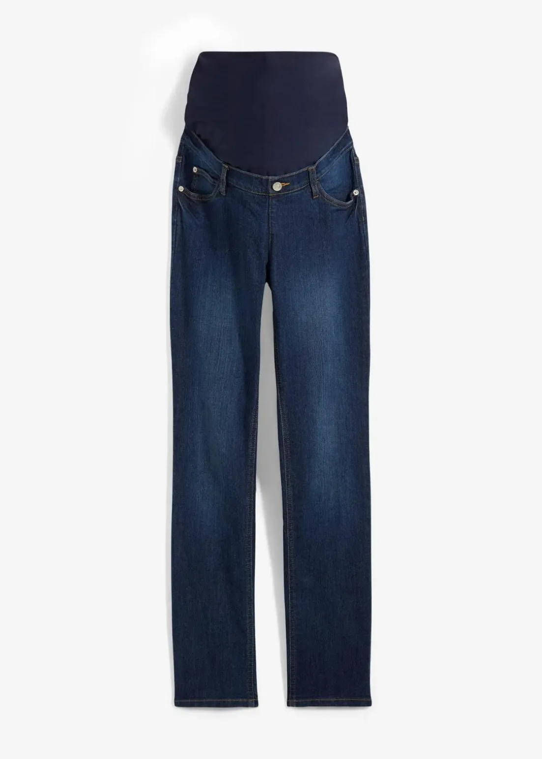 5-Pocket-Jeans aus Baumwolldenim und Elasthan mit echten Taschen vorne und hinten. Gerades, langes Bein. Der breite Bund aus Baumwolljersey sorgt für eine optimale Passform am Bauch. Der Bund lässt sich durch einen innenliegenden Gummizug dem wachsenden Babybauch anpassen.