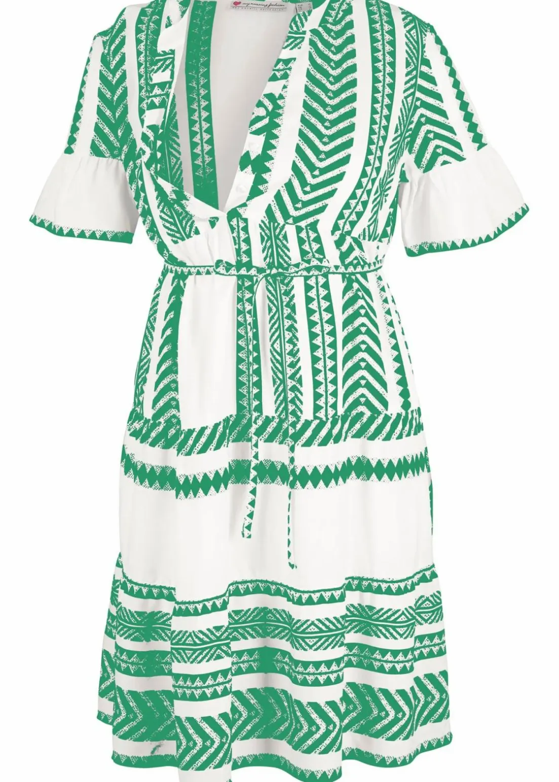 Tunika-Kleid aus gewebter Viskose mit Rundhalsausschnitt und langer Knopfleiste, die ein einfaches Stillen ermöglicht. Die halblangen Ärmel sind mit Volants verziert und der Rock in A-Linie ist in mehreren Stufen genäht und sorgt für einen eleganten Fall. Das abnehmbare Bindeband dient der Regulierung der Weite.