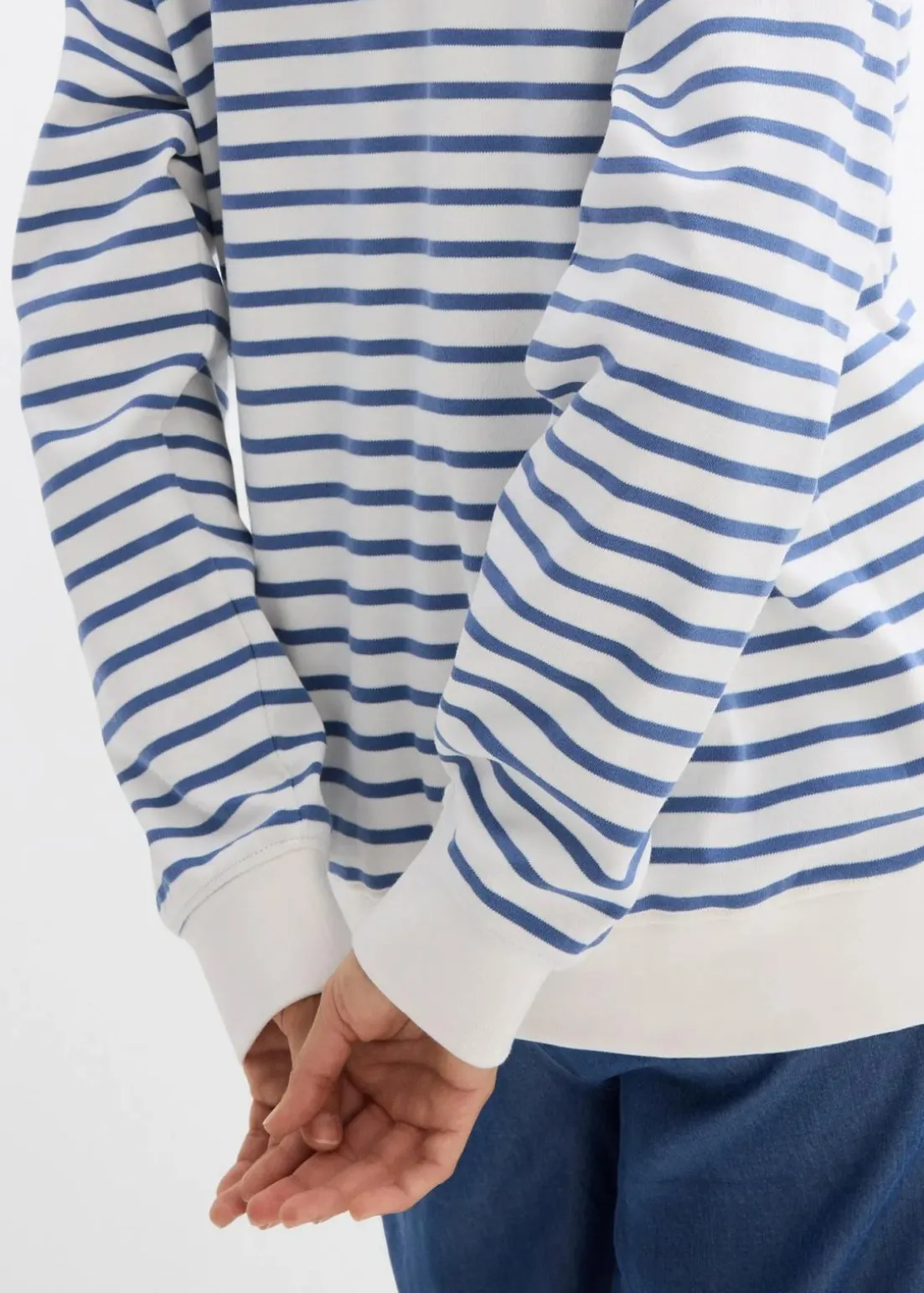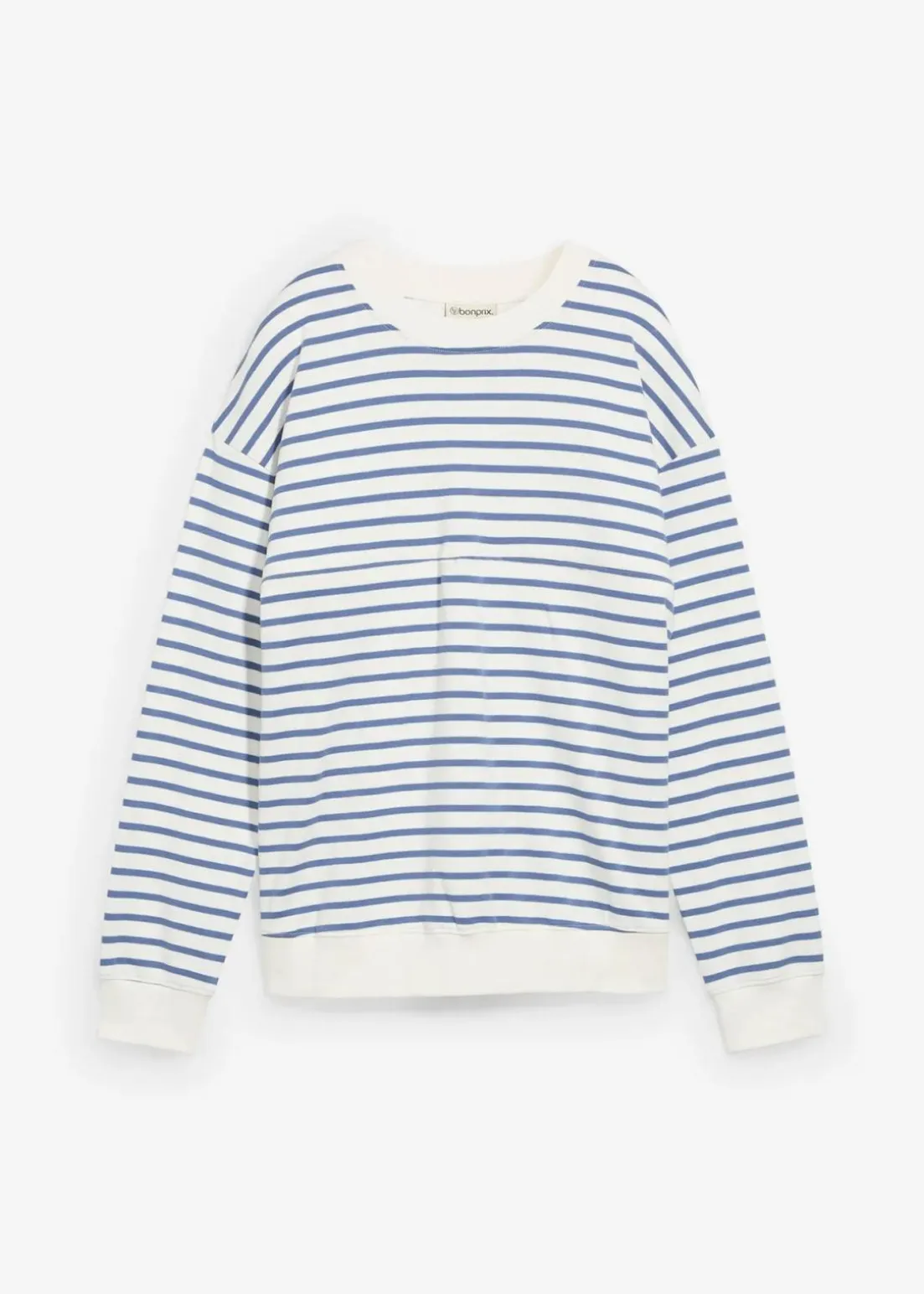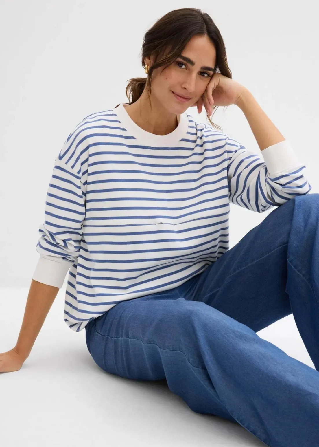 Gestreiftes Umstandsshirt aus weichem, dicht gewebtem Jersey aus Bio-Baumwolle mit äußerst diskreter Stillfunktion: Reißverschlüsse auf beiden Seiten ermöglichen ein komfortables und unkompliziertes Stillen für Mutter und Kind.