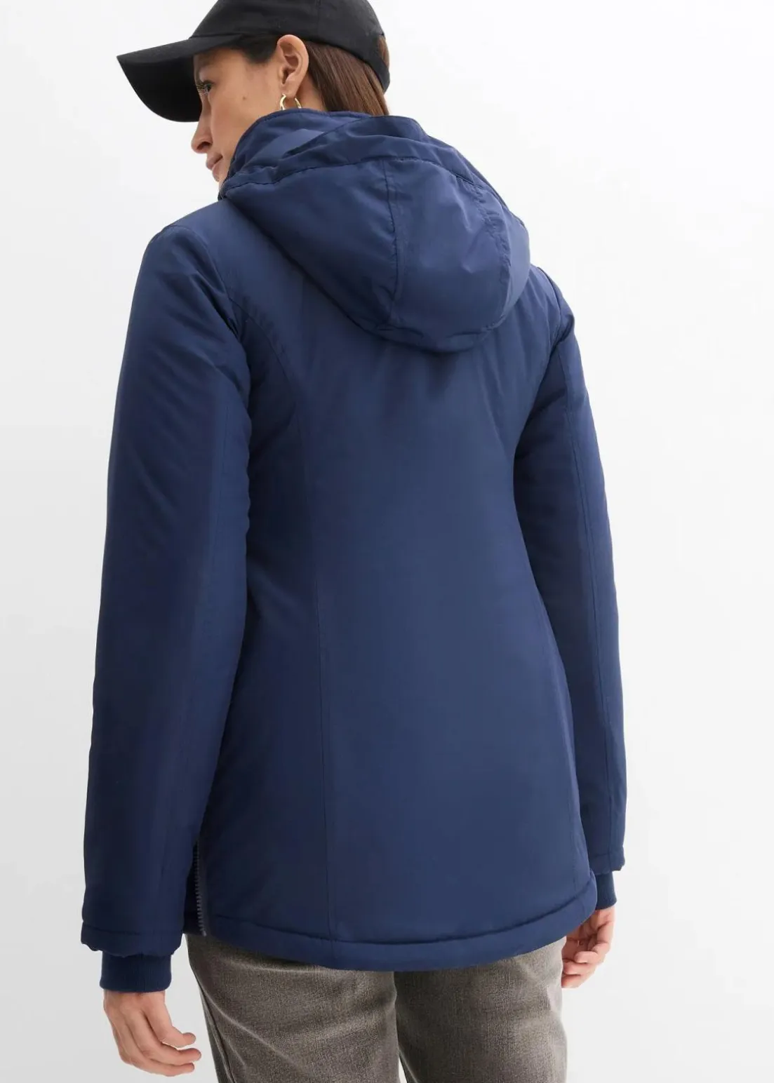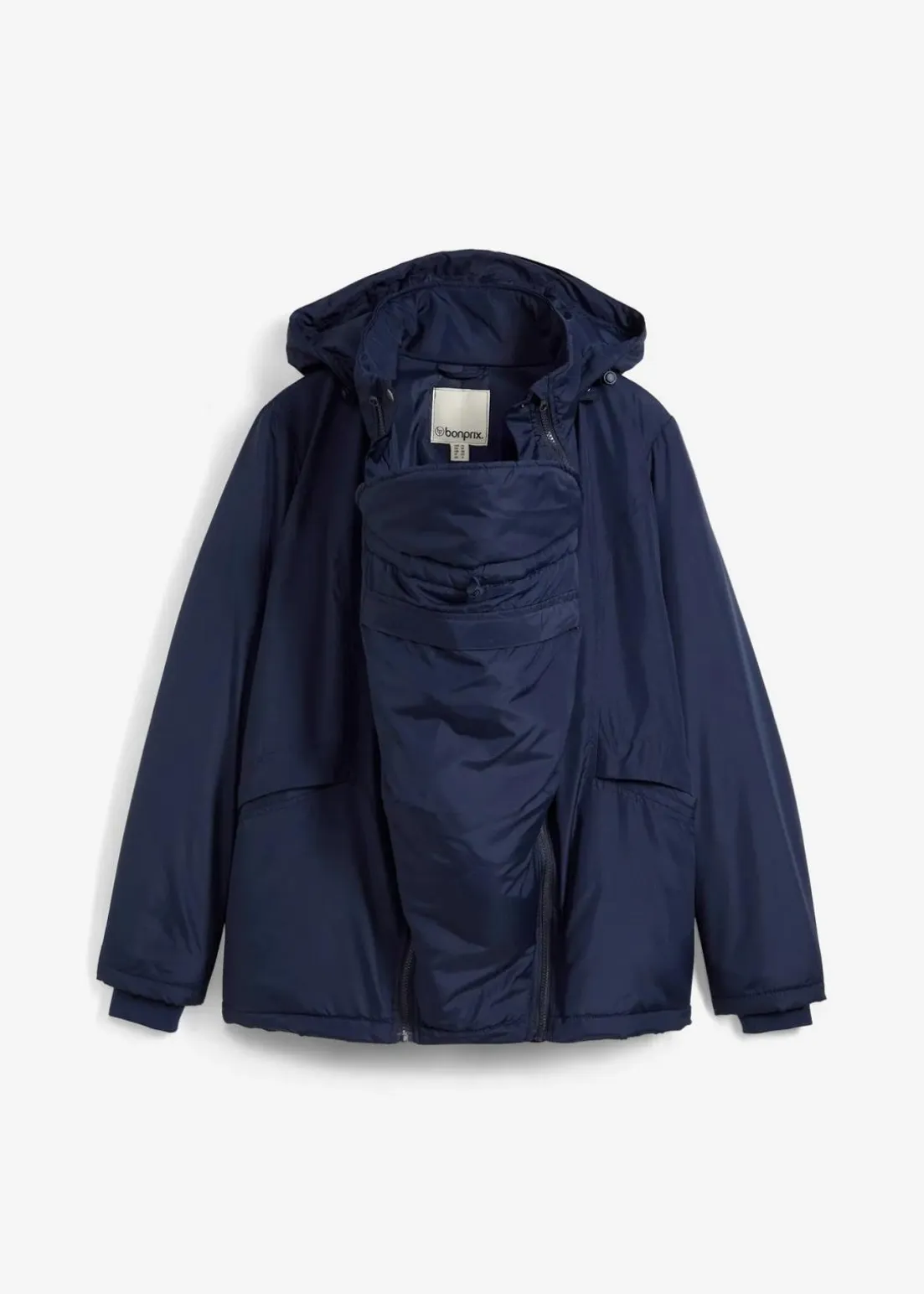Leicht wattierte, Regen- und windabweisende Funktionsjacke mit einem Trageinsatz für das Baby. Der Trageeinsatz hat eine aufgesetzte Tasche mit Reißverschluss. In dieser Tasche versteckt sich ein Regen- Sonnen- bzw. Sichtschutz für das Kind. Die große Kapuze mit einem elastischen Kordelzug und einer Regenblende schützt die Mutter vor Wind und Wetter. Die Jacke verfügt über seitliche Reißverschlüsse zur Regulierung der Weite, die das Tragen sowohl in als auch nach der Schwangerschaft ermöglichen. Mit praktischen Zippertaschen.
