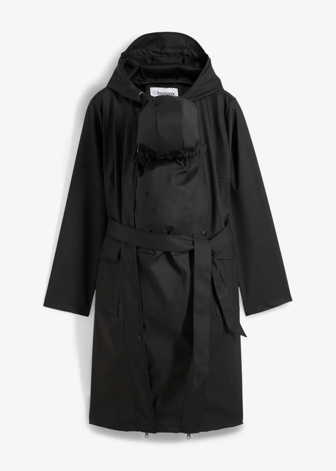 Der wind- und regendichte Umstandsmantel bietet optimalen Schutz für unbeständiges Wetter, sowohl für die Mutter als auch für das Baby. Die Regenjacke verfügt über zwei Einsätze: einen Erweiterungseinsatz für die Schwangerschaft und einen Trageeinsatz für das Baby, der mit einer kleinen Kapuze ausgestattet ist. Auch die Mutter wird durch eine große Kapuze geschützt. Zusätzlich bietet der Mantel große aufgesetzte Taschen und ein abnehmbares Bindeband zur individuellen Weitenregulierung. Luftlöcher unter den Armen sorgen für eine angenehme Belüftung.