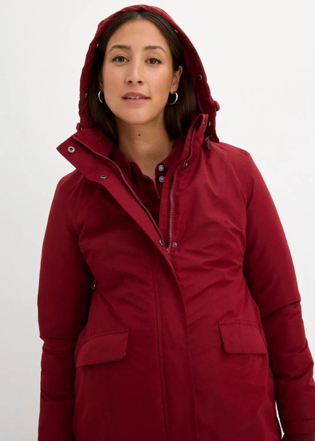 Mittelwarm wattierter Umstandsmantel aus wind- und wasserabweisendem Funktionsstoff. Seitliche Reißverschlüsse bieten zusätzliche Weite und ermöglichen die Jacke nach der Schwangerschaft weiterhin zu tragen. Ein abnehmbarer Trageeinsatz mit Kapuze schützt das Baby vor Wind und Wetter. Mit Stehkragen mit Druckknöpfen, Kapuze mit abnehmbarem Fellkragen. Große, warm gefütterte Taschen und Ärmelabschlüsse aus Baumwollripp.