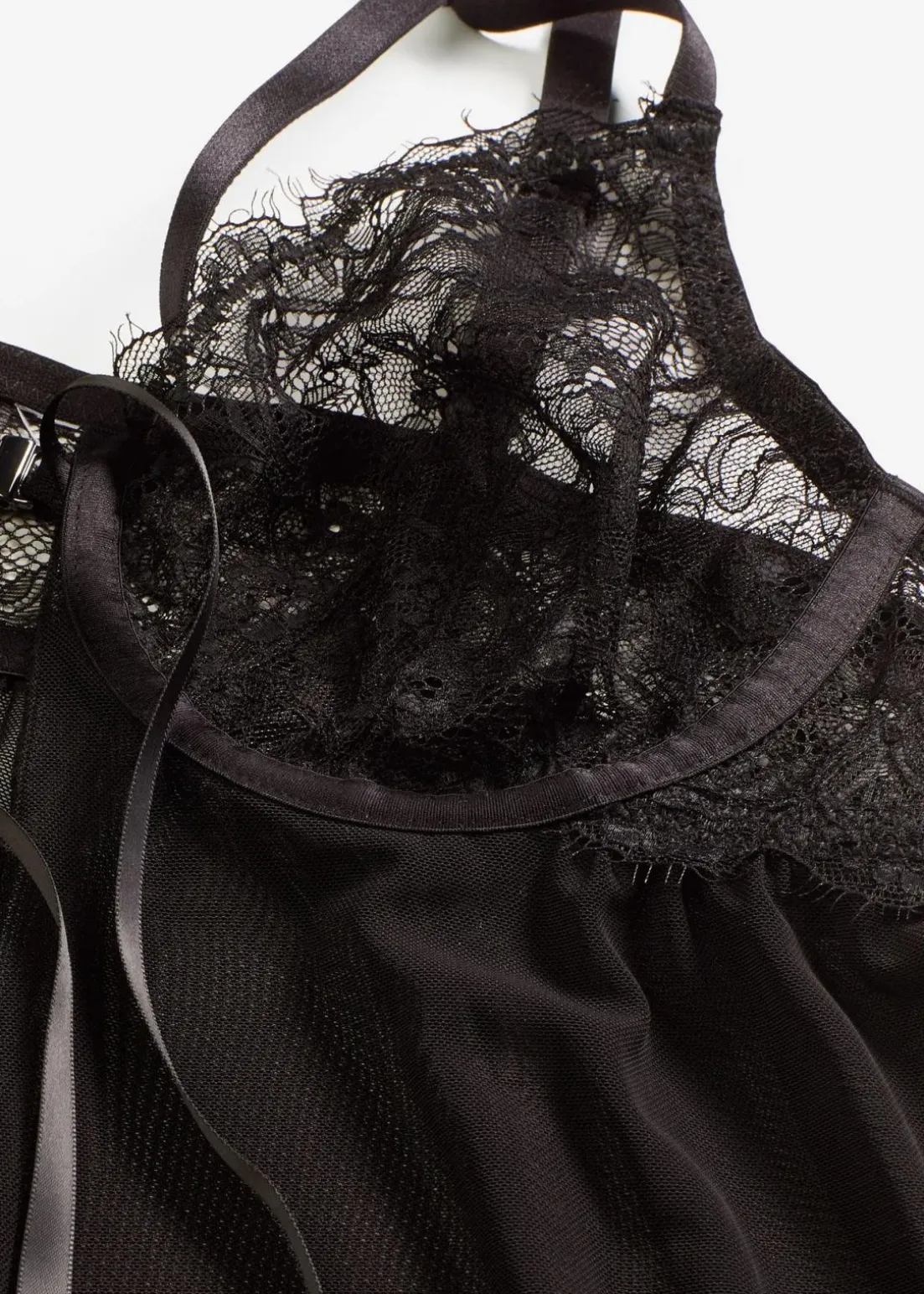 Babydoll + String (2-tlg.Set) aus feiner Spitze und transparentem Mesh.