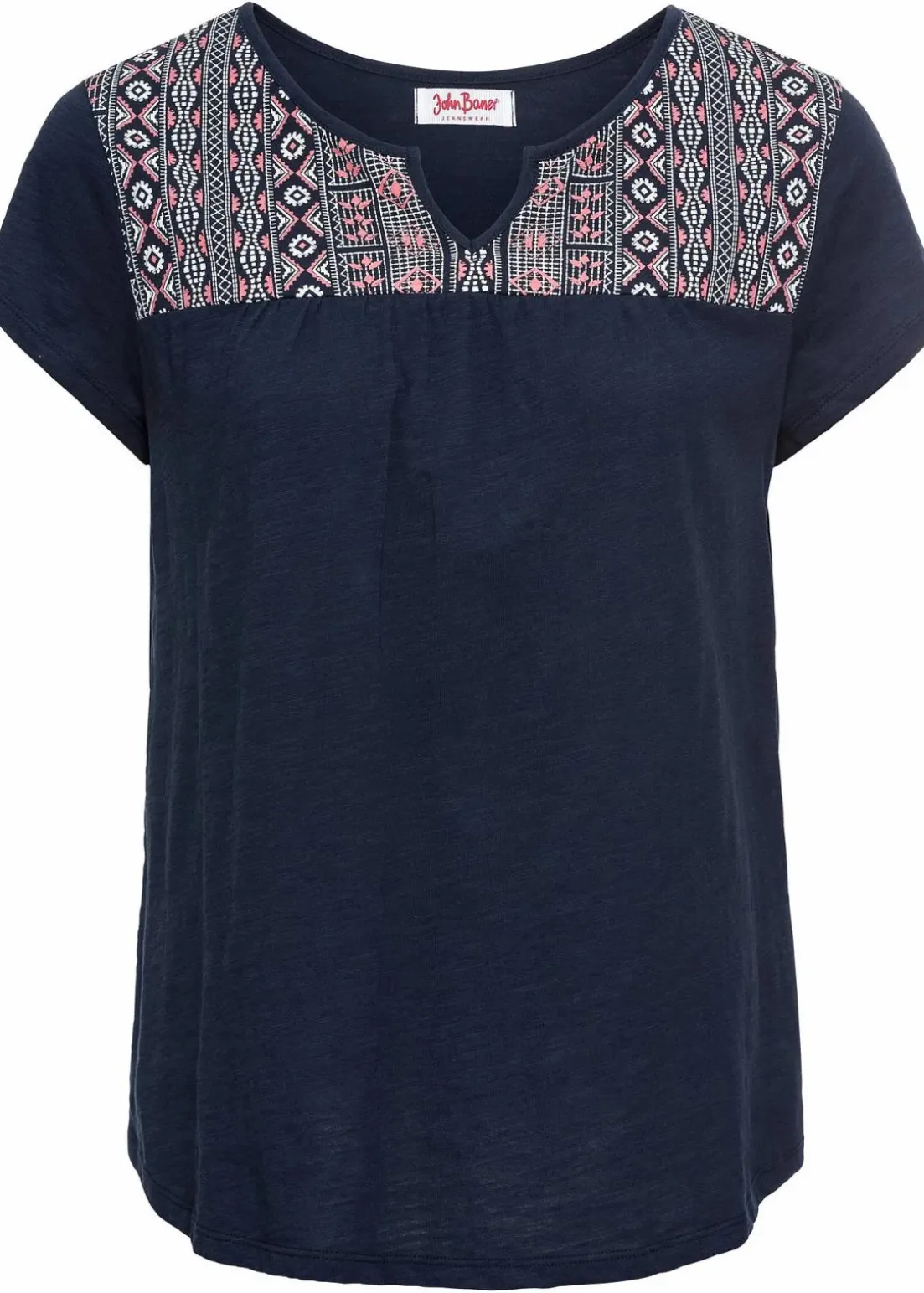 Das hüftbedeckende Kurzarm-Shirt in figurschmeichelnder A-Form setzt auf kleine Details. Dazu gehören ein kleiner V-förmiger Cut-Out am hochgeschlossenen Rundhals-Ausschnitt sowie der coole Print im oberen Bereich. Der daran anschließende Stoff ist in kleine Falten gelegt.Jedes dieser Modelle von John Baner ist ein Unikat. Das bedruckte Kurzarm-Shirt in A-Form mit Henley-Kragen sieht vor allem zu schmalen Jeans und Ballerinas sehr ansprechend aus.
