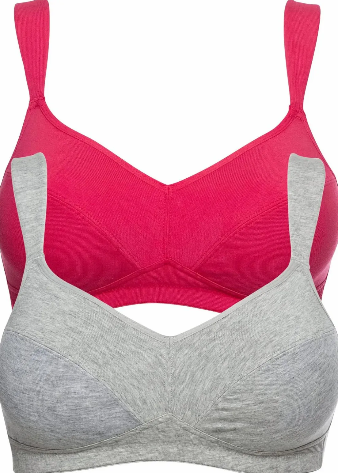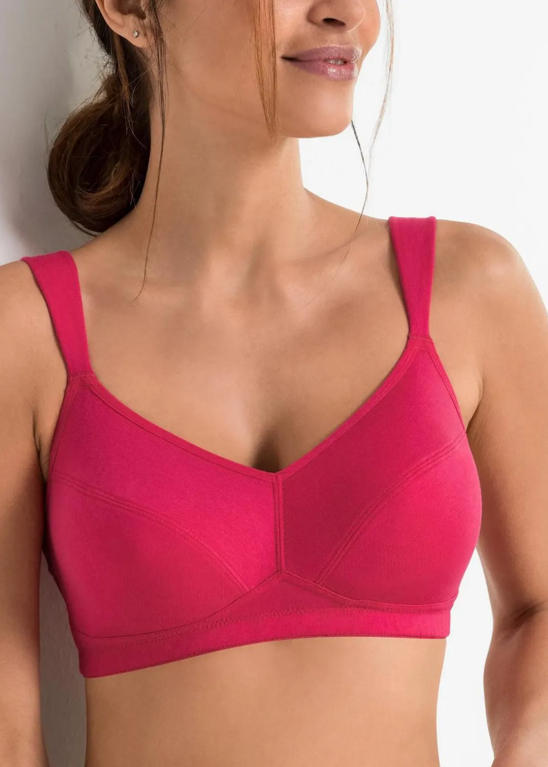 Diesen schlichten BH muss Frau einfach lieben! Er ist aus weicher Bio-Baumwolle ohne Bügel gefertigt und kommt direkt im vorteilhaften Multipack. Formgebende Teilungsnähte und eine cleane Optik verleihen ihm den modischen aber unaufdringlichen Look, während die breiten, verstellbaren Träger und das elastische Unterbrustband den Komfort erhöhen. Zu schließen ist das Wohlfühlwunder über einen Haken-und-Ösenverschluss an der Rückseite und fällt wie die Träger, in größeren Cup-Größen etwas weiter aus.