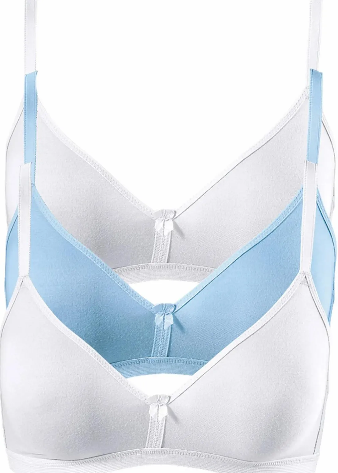 Durch seine nahtlos vorgeformten Cups und die Bio-Baumwolle sitzt der BH angenehm weich auf der Haut, ohne dabei zu drücken. Hoher Schnitt der Cupform sowie schmale Träger sorgen zusätzlich für ein schönes Dekolleté. Ein dezenter Hingucker findet sich in der Schleife am Mittelsteg.Der BH von bpc kommt ohne Bügel aus und eignet sich so ideal zum Tragen unter figurbetonenden Tops oder T-Shirts. Im 3er-Pack ist die Wäschemode in den Varianten 2x weiß und 1x hellblau, 2x schwarz und 1x aubergine sowie 1x schwarz, 1x weiß und 1x rot erhältlich.