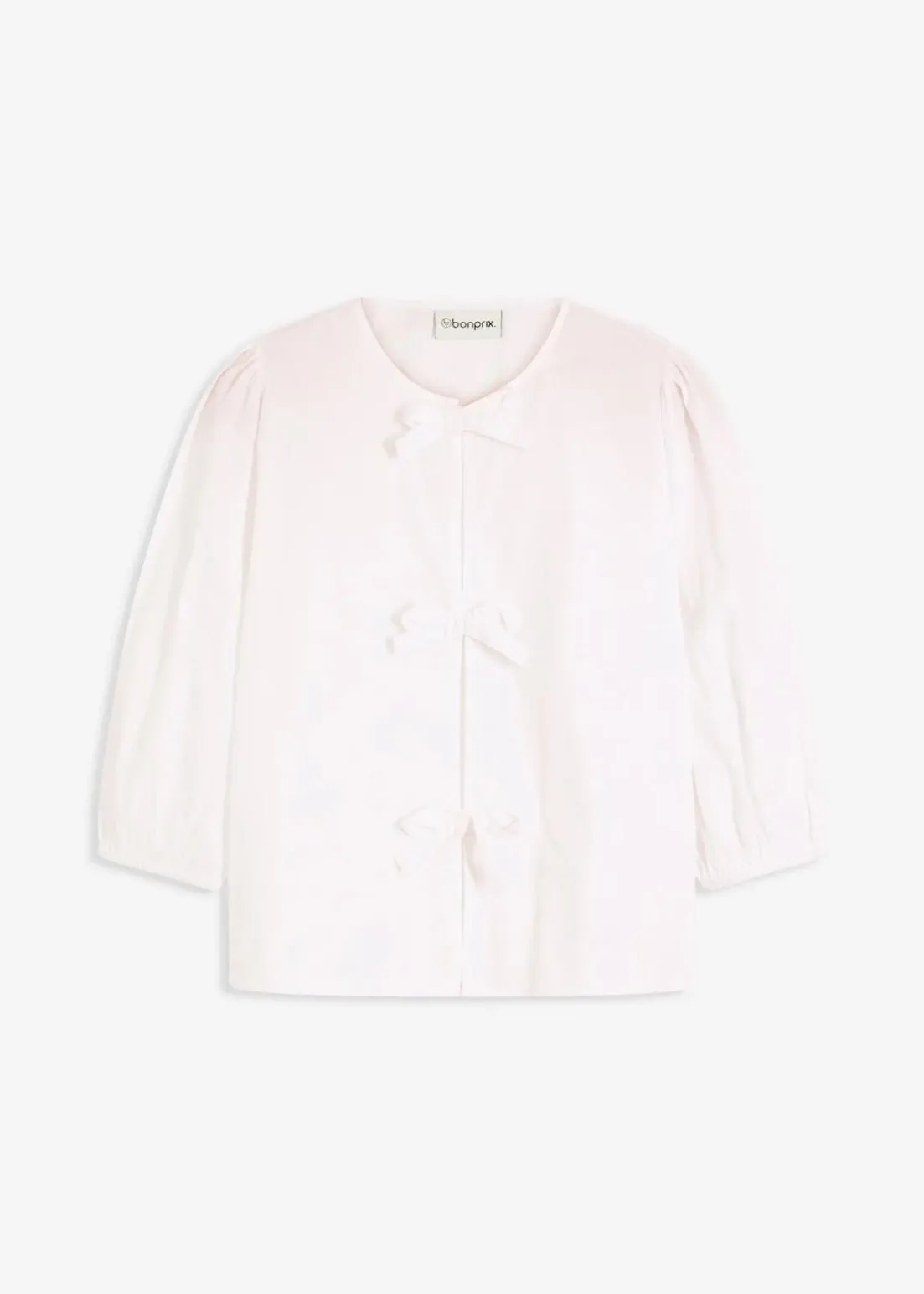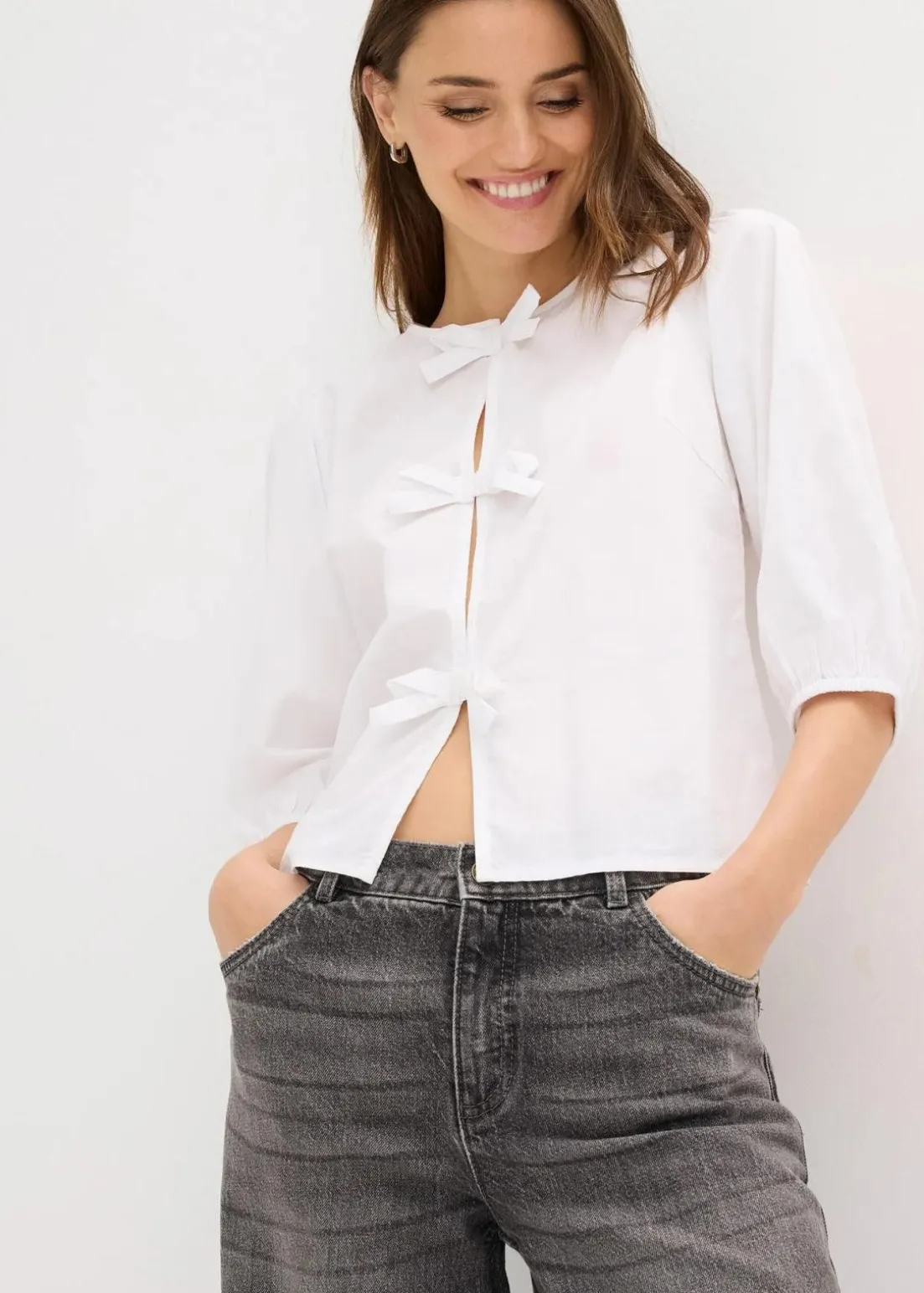 modische Bluse mit dekorativen Schleifen vorne und Puffärmeln, Verschluss mit Druckknöpfen