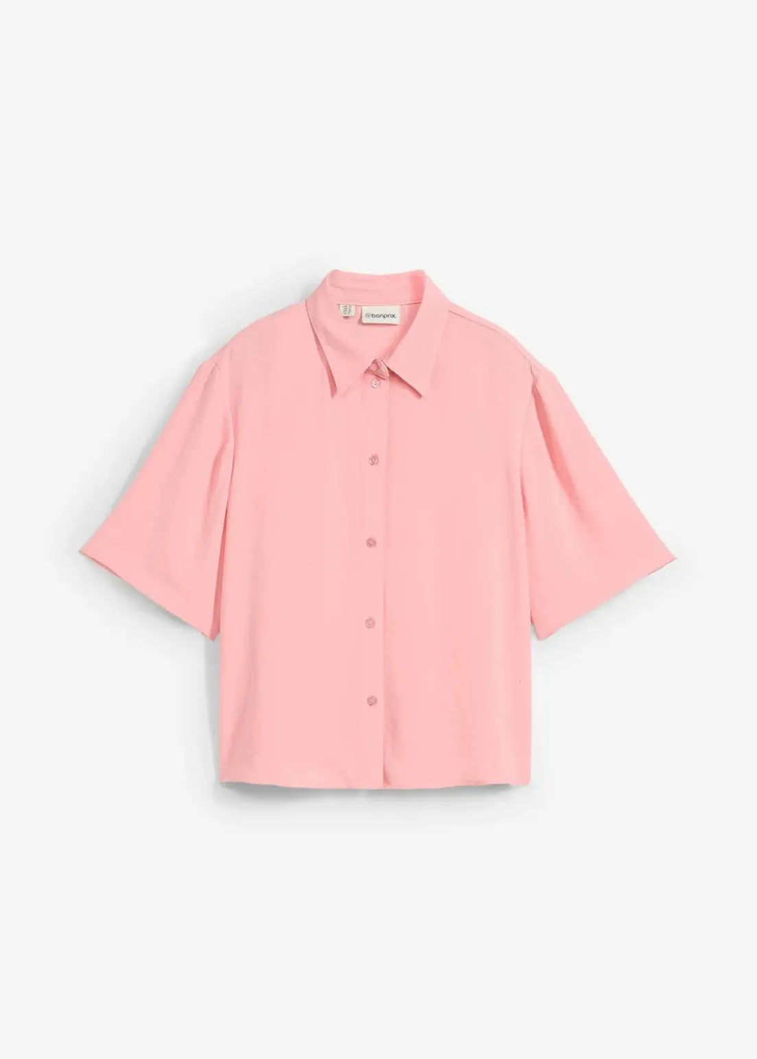 Leicht verkürzte, kastige Hemdbluse mit Halbarm, Umlegekragen und Knopfleiste.