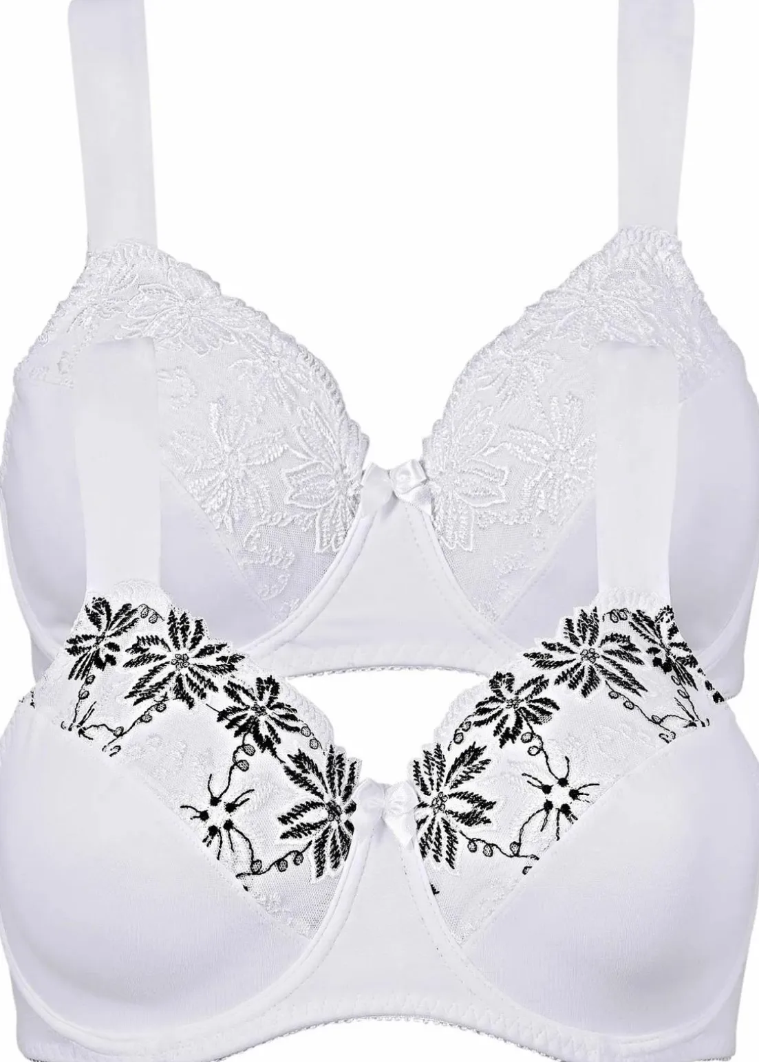 BH mit Bügel. Im praktischen 2er Pack. Je 1x weiß mit attraktiver Stickerei in schwarz/weiß und 1x mit einfarbiger Stickerei am oberen Cup. Die weich gepolsterten Träger des BHs entlasten die Schultern und bieten einen angenehmen Tragekomfort.