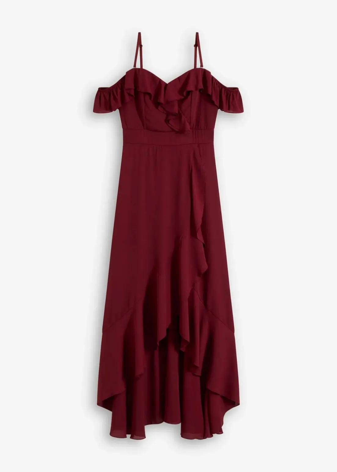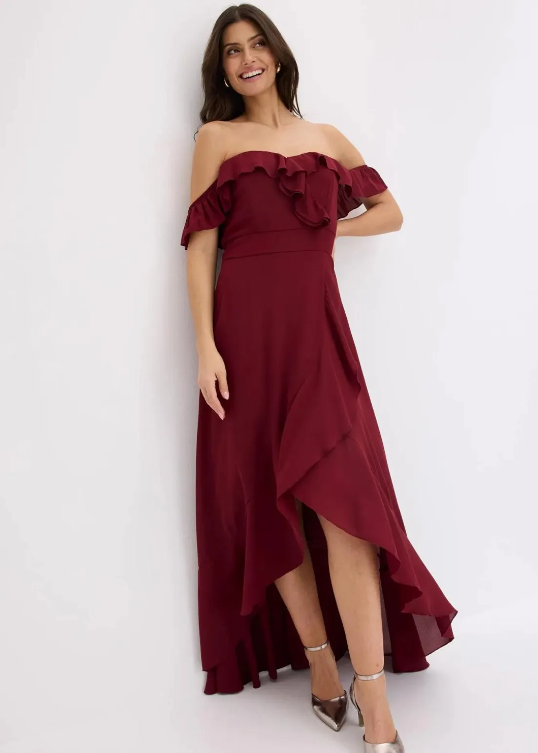Modern und feminin: Abendkleid mit verstellbaren Trägern und Carmen-Ausschnitt sowie Volants
